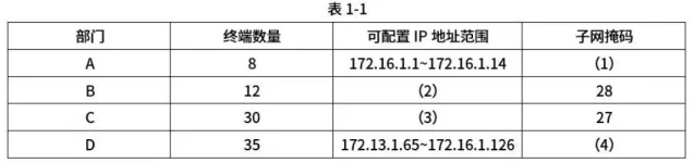 该企业办公网络采用172.16.1.0/25地址段,部门终端数量如表1-1所示,请将网络地址规划补充完整。