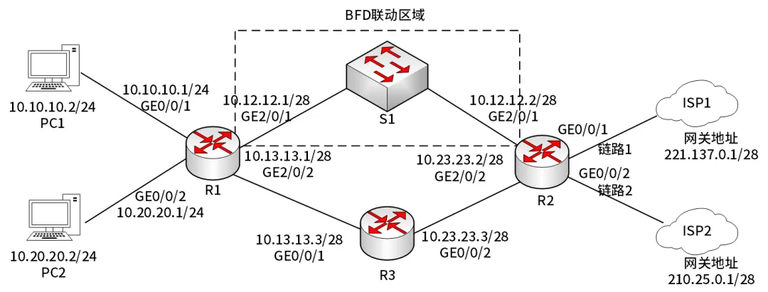 图1为某公司网络拓扑片段,从R1到R2有两条转发路径,下一跳分别为R2和R3。由于R1和R2之间物理距离较远,通过一个二层交换机S1作为中继。假设图中设备已完成接口IP地址配置。