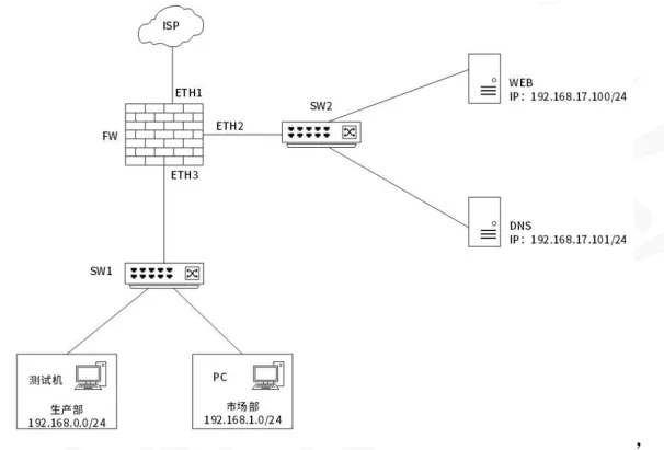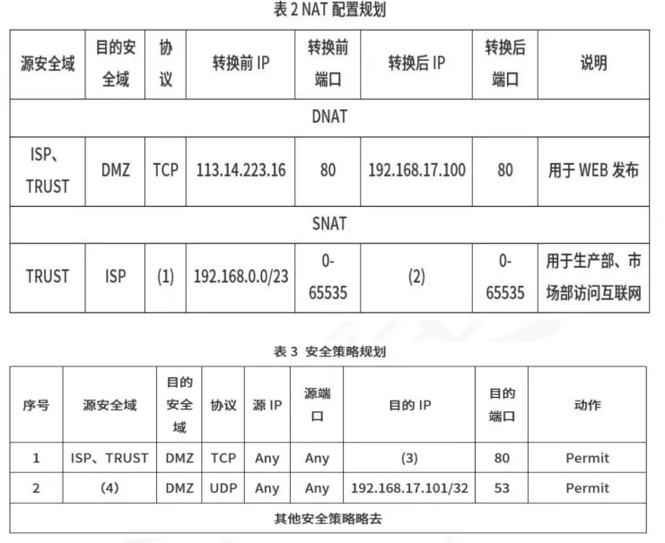 某企业网络拓扑如图1所示,注册xyz.cn域名对外提供WEB服务,接入ISP并获得1个公网IP地址(113.14.223.16)用于对外提供WEB服务和内部用户访问互联网