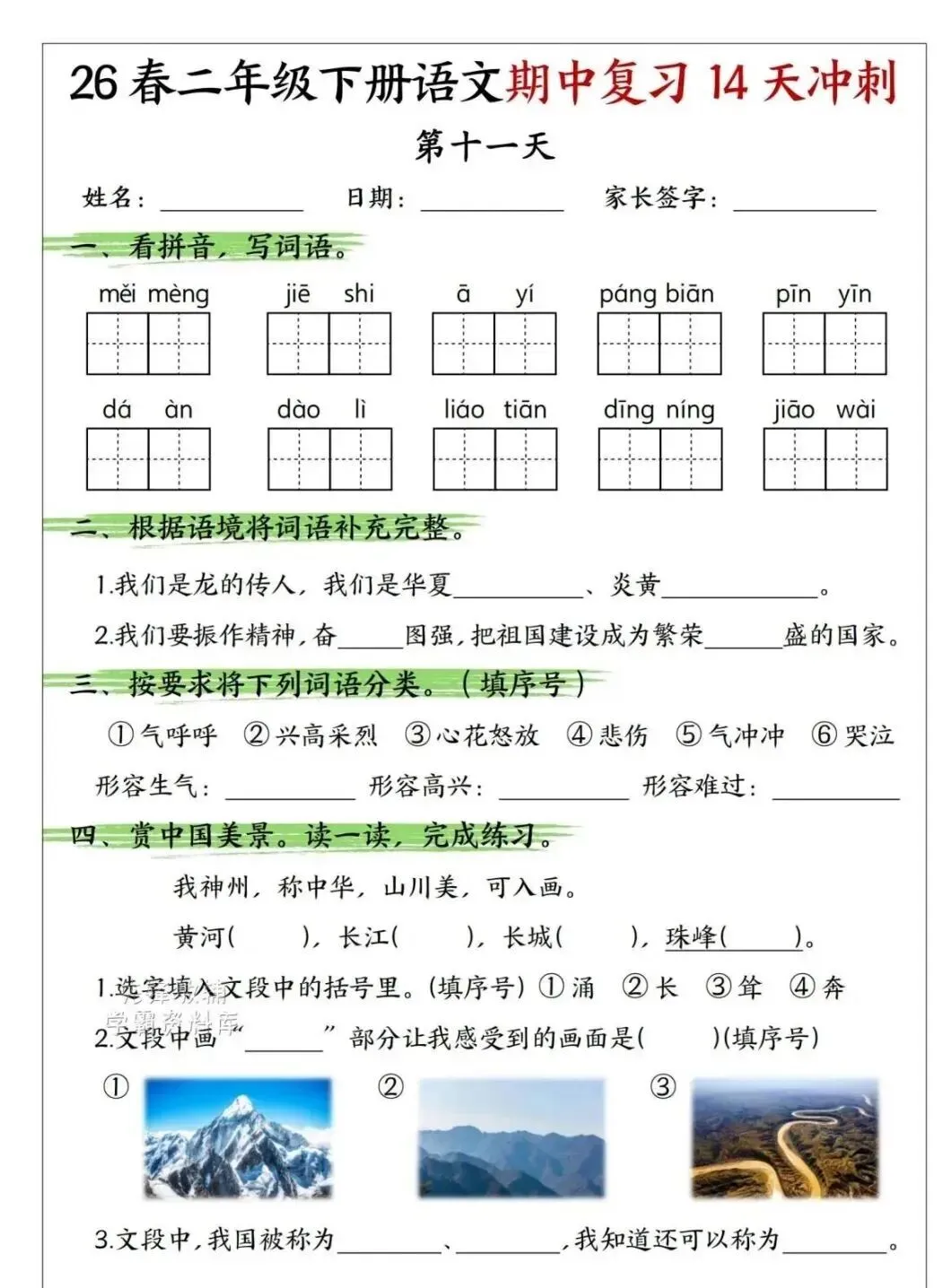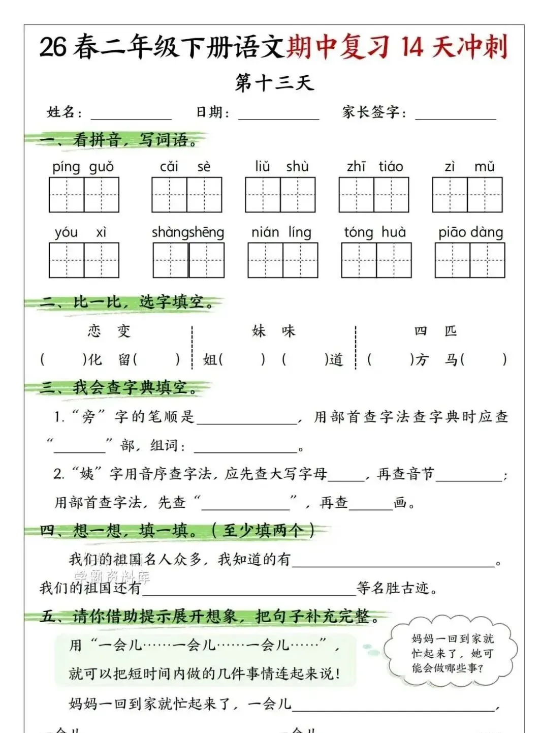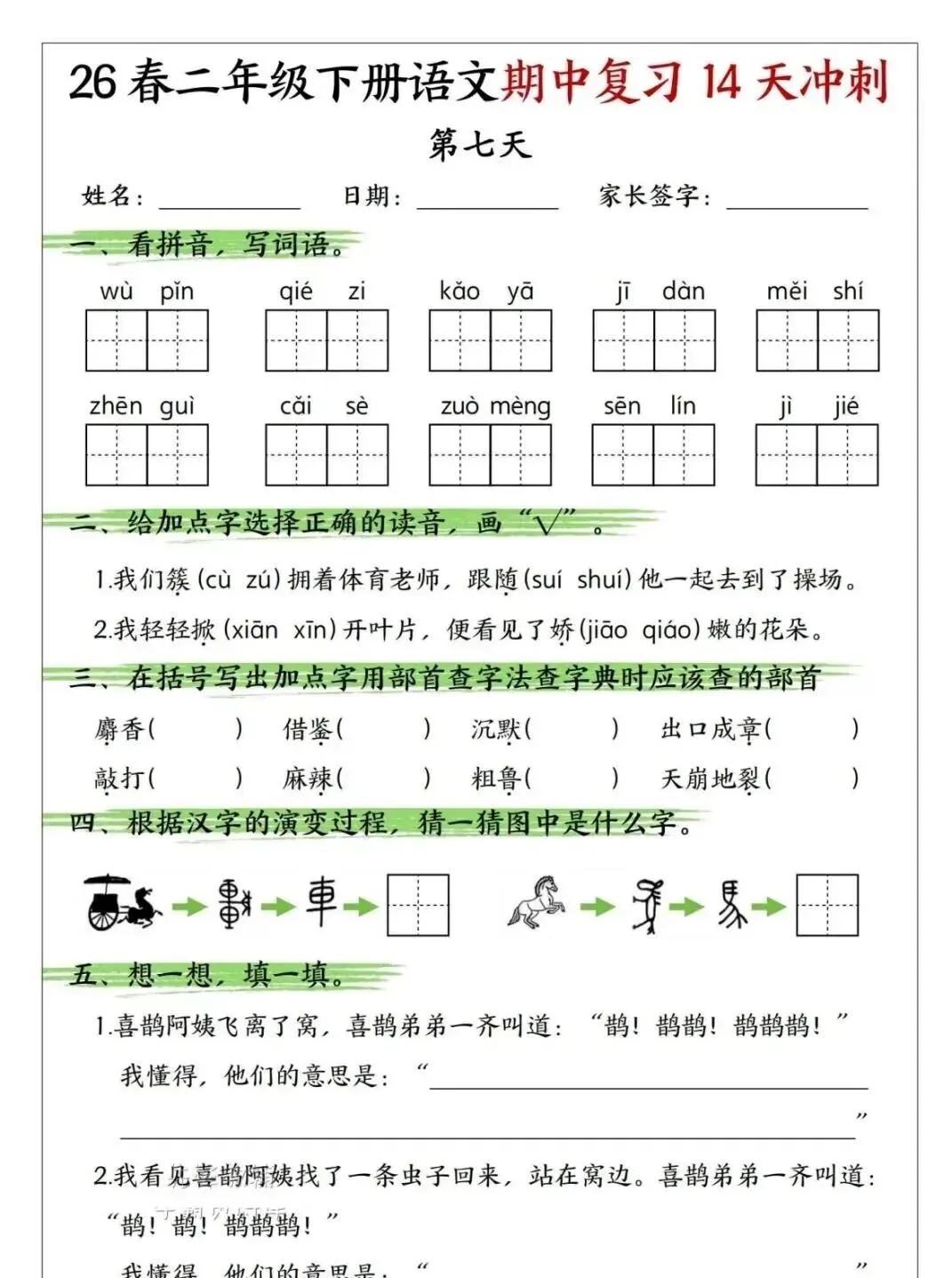 小学语文二年级下册期中复习14天冲刺|可下载打印 点击上方“语数英培优学堂”↑↑↑关注我 版面有限,不过多展示 需要直接拉至文末下载 完整电子打印版免费领取方式 ▲点击上方 语数英培优学堂 在公众号消息框发送: 11451,即可免费领取