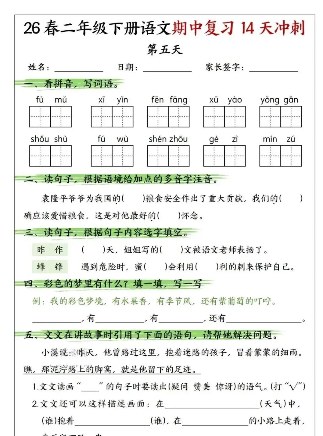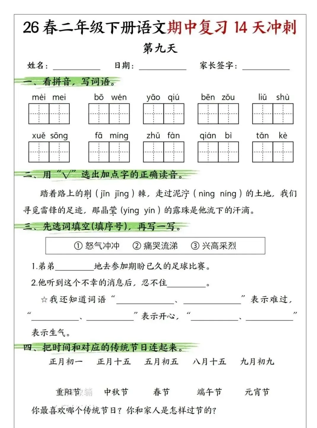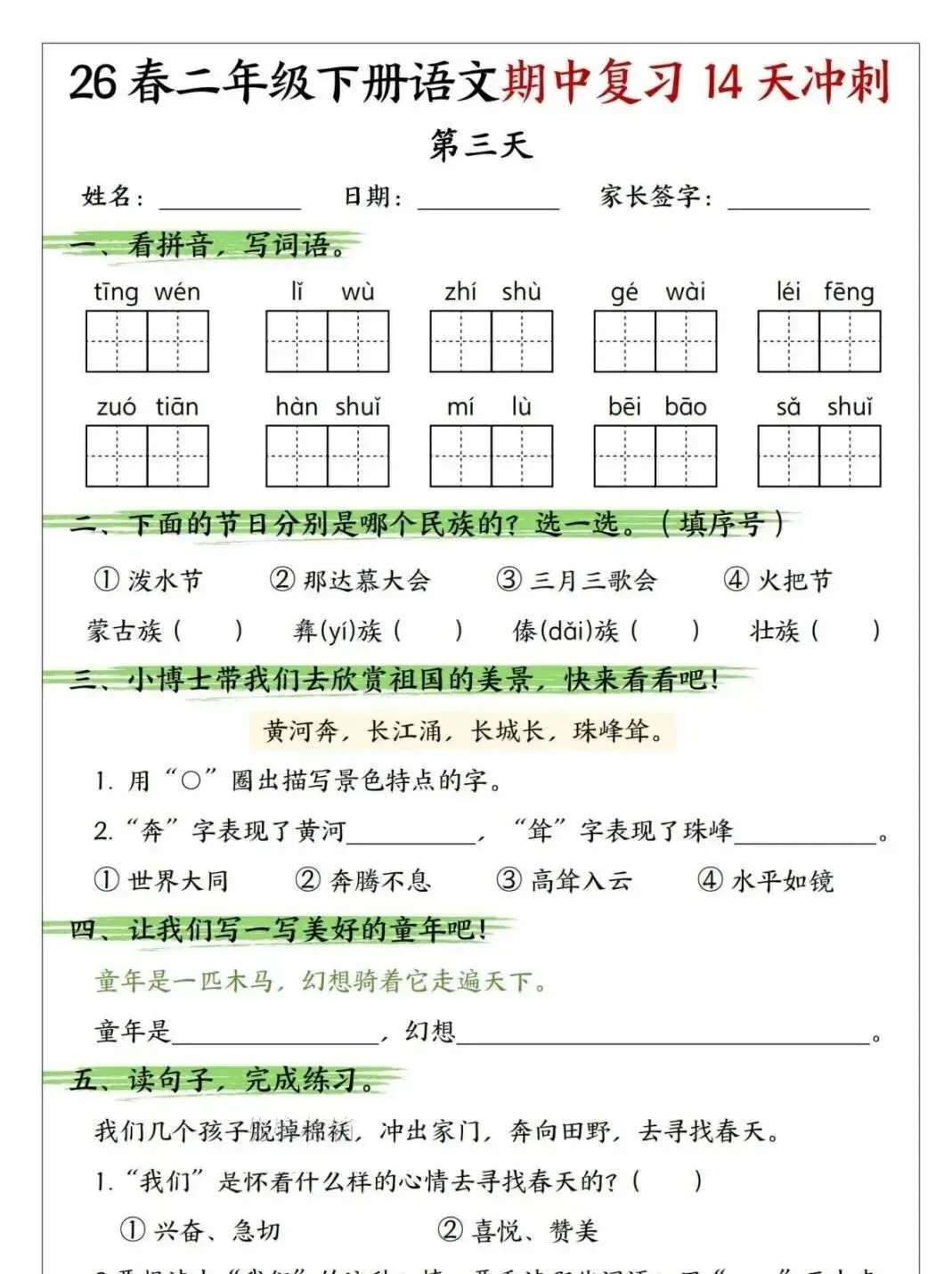小学语文二年级下册期中复习14天冲刺|可下载打印 点击上方“语数英培优学堂”↑↑↑关注我 版面有限,不过多展示 需要直接拉至文末下载 完整电子打印版免费领取方式 ▲点击上方 语数英培优学堂 在公众号消息框发送: 11451,即可免费领取