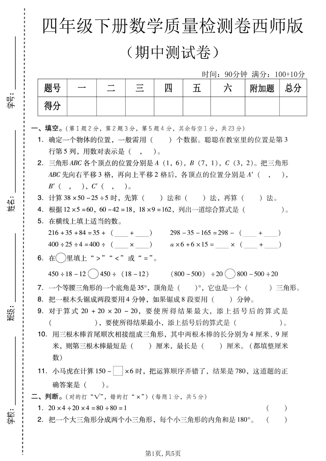 嗨!我是一一妈,今日分享26年西师版《四年级下册数学期中质量检测卷,含答案》电子版可下载打印。