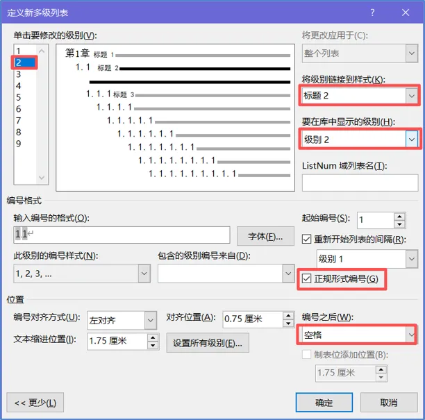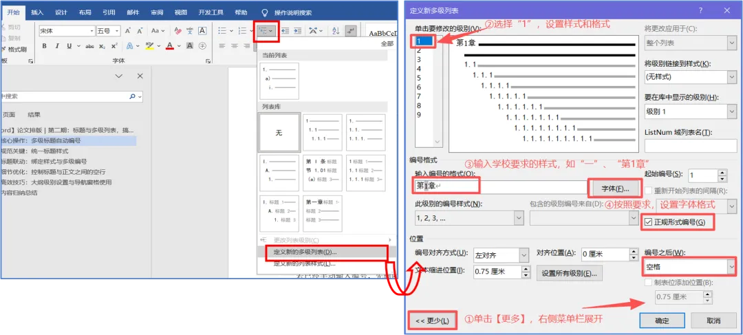 在弹框中,单击【更多】,右侧菜单栏完全展开,可以设置每级标题格式,以1级标题为例: