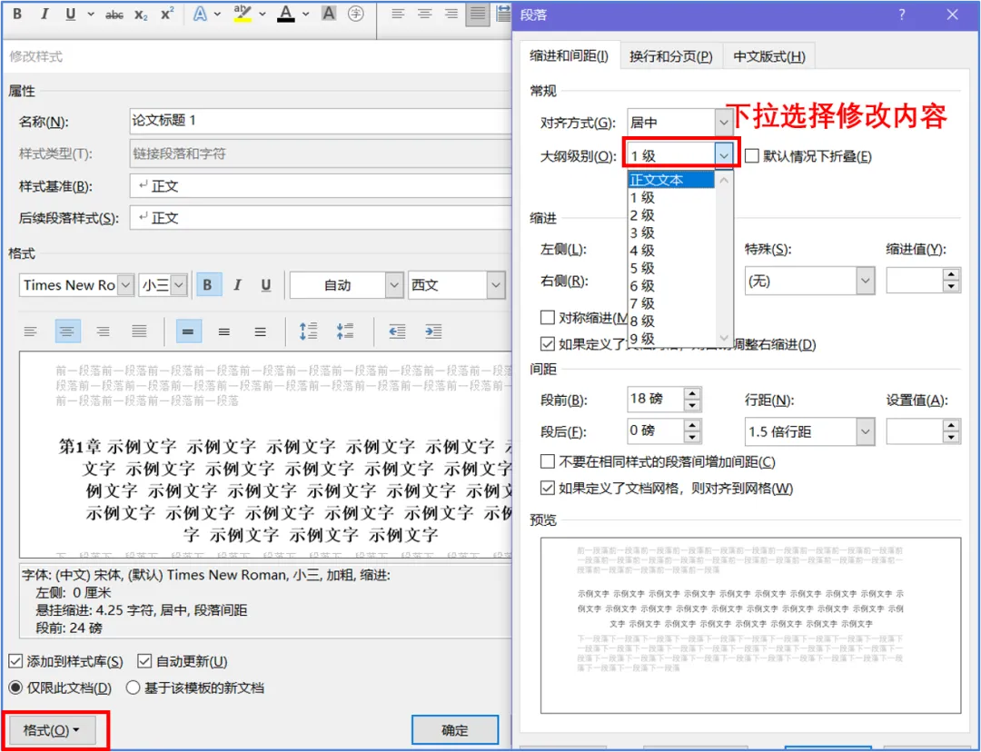 A2.在弹出的“修改样式”窗口中,按学校要求设置字体、字号、对齐方式、行距、缩进等。
