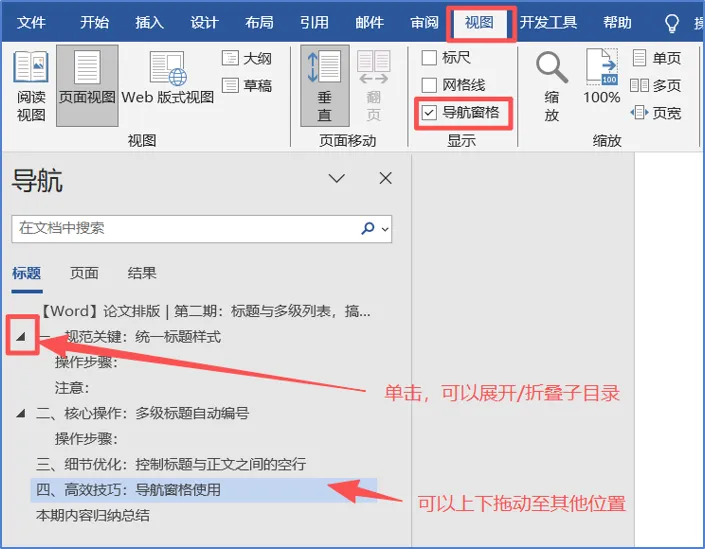导航窗格就像文档的“地图”,能清晰显示所有设置了大纲级别的标题,点击就能快速跳转,还能拖动调整章节顺序。