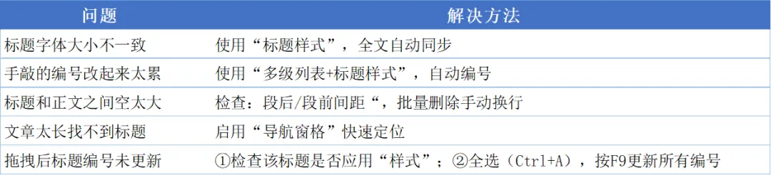 ④标题编号更新:拖拽后标题编号未更新,首先检查该标题是否应用“样式”;再全选(Ctrl+A),按F9更新所有编号。