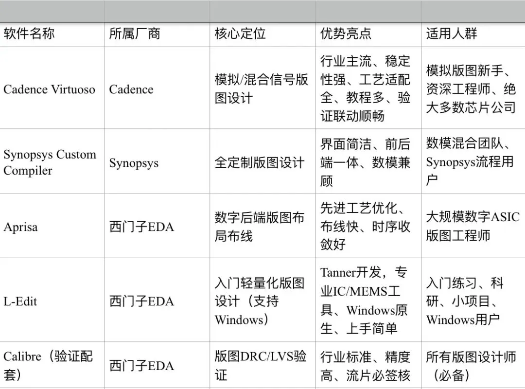 二、版图设计核心软件,一张表对比清楚