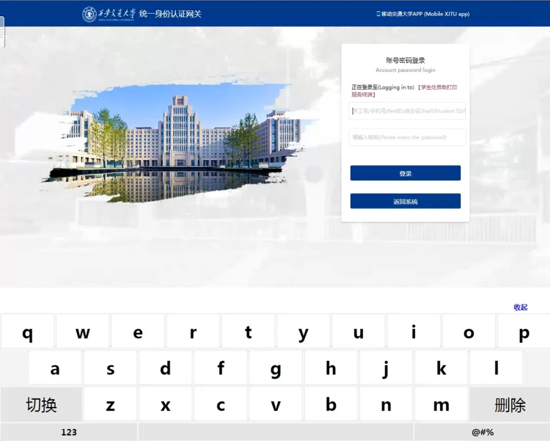 选择统一身份认证登录方式,点击统一身份认证图标后,跳转至登录页面进行登录,输入账号、密码,验证成功后登录系统。