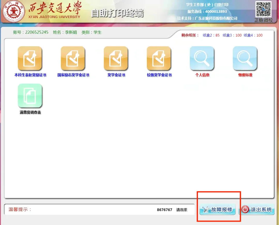 当打印出现问题时,可点击右下角故障报修,以便相关老师及时处理问题。也可加入反馈QQ群:1061355474,进群申请需提供“姓名+学号”验证。