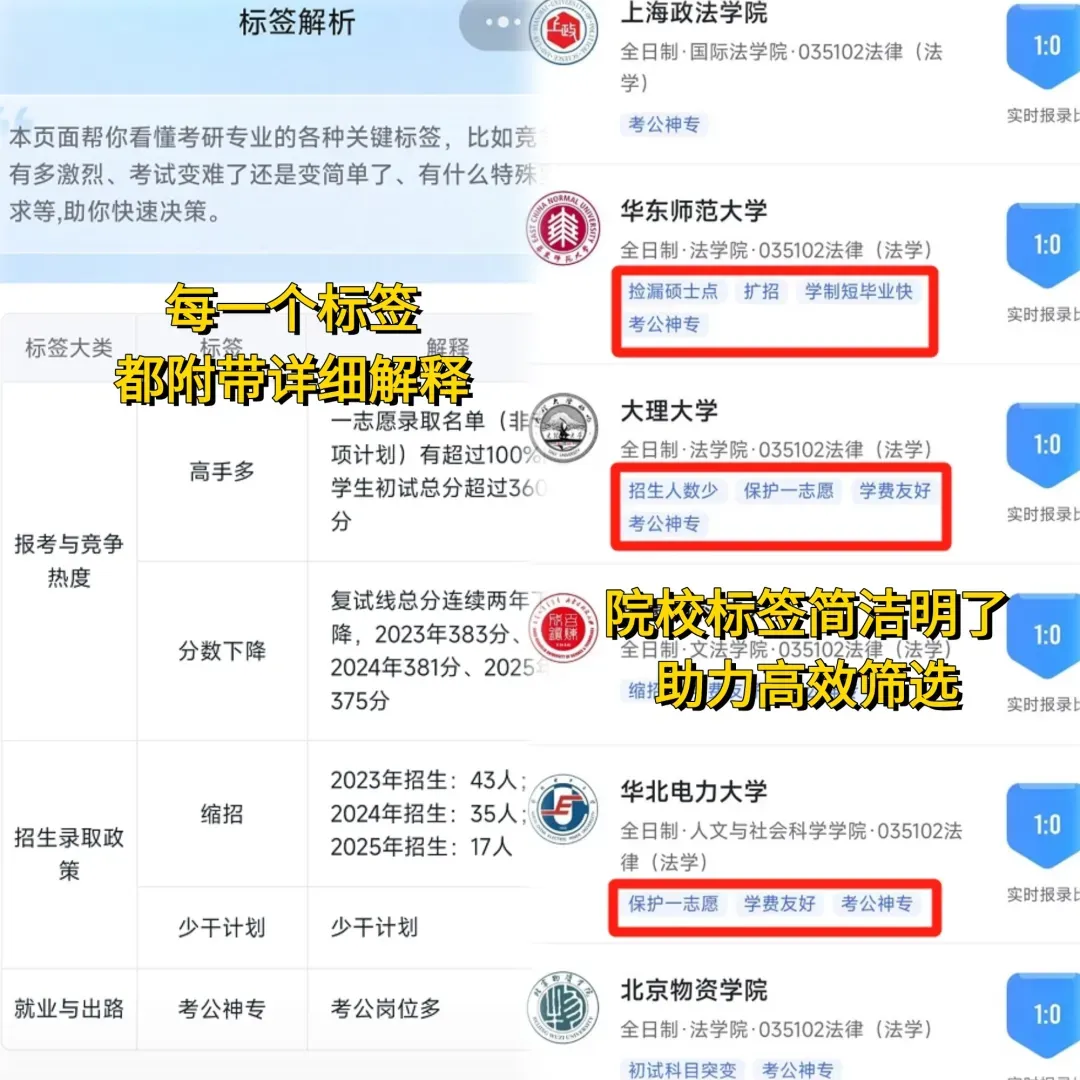 • 标签解析:3秒钟判断学校是“宝藏”还是“雷区”!比如“报录比低”“保护一志愿”…一眼看透院校本质;