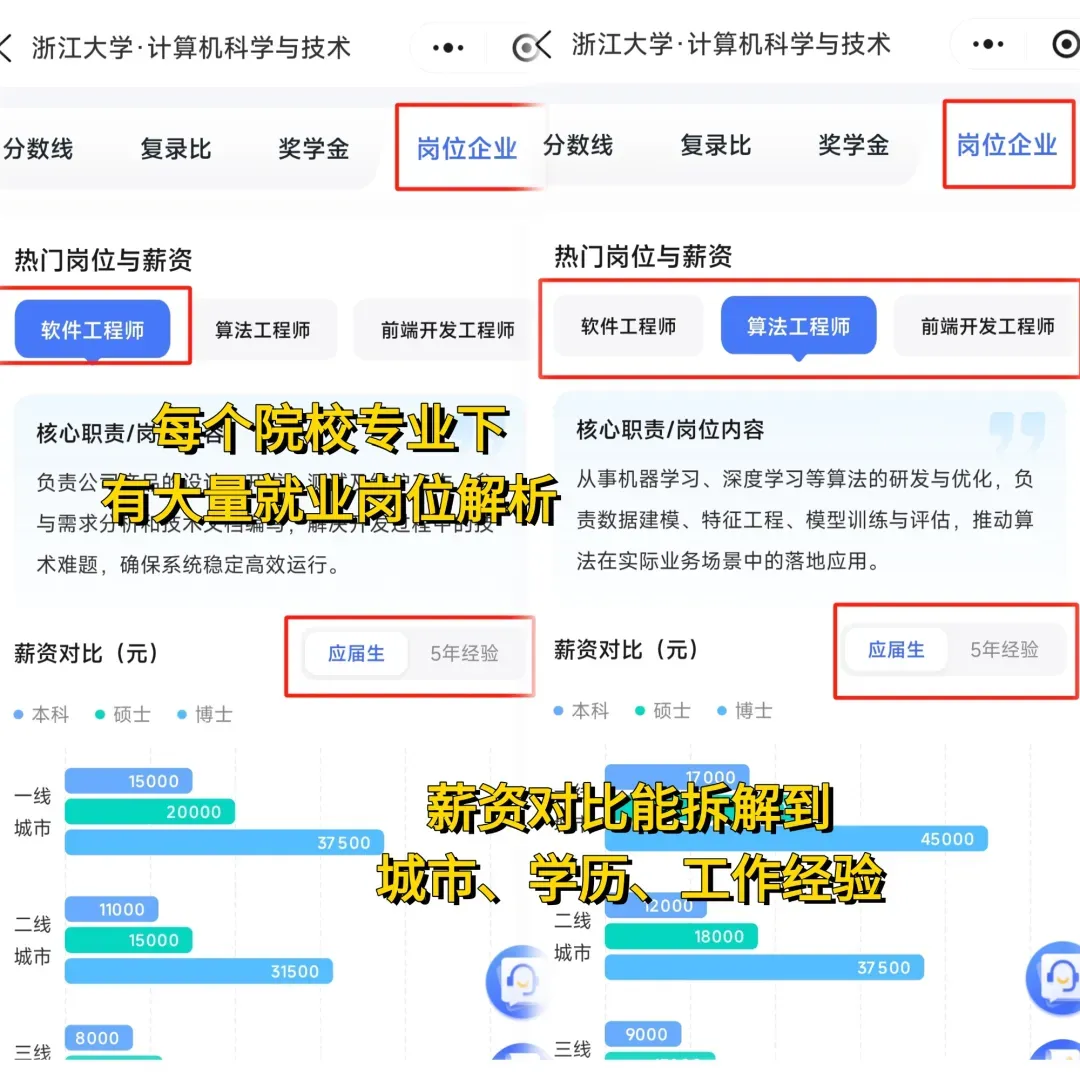 • 就业分析:毕业后能去什么单位?月薪多少?热门专业的薪资、发展路径一目了然;