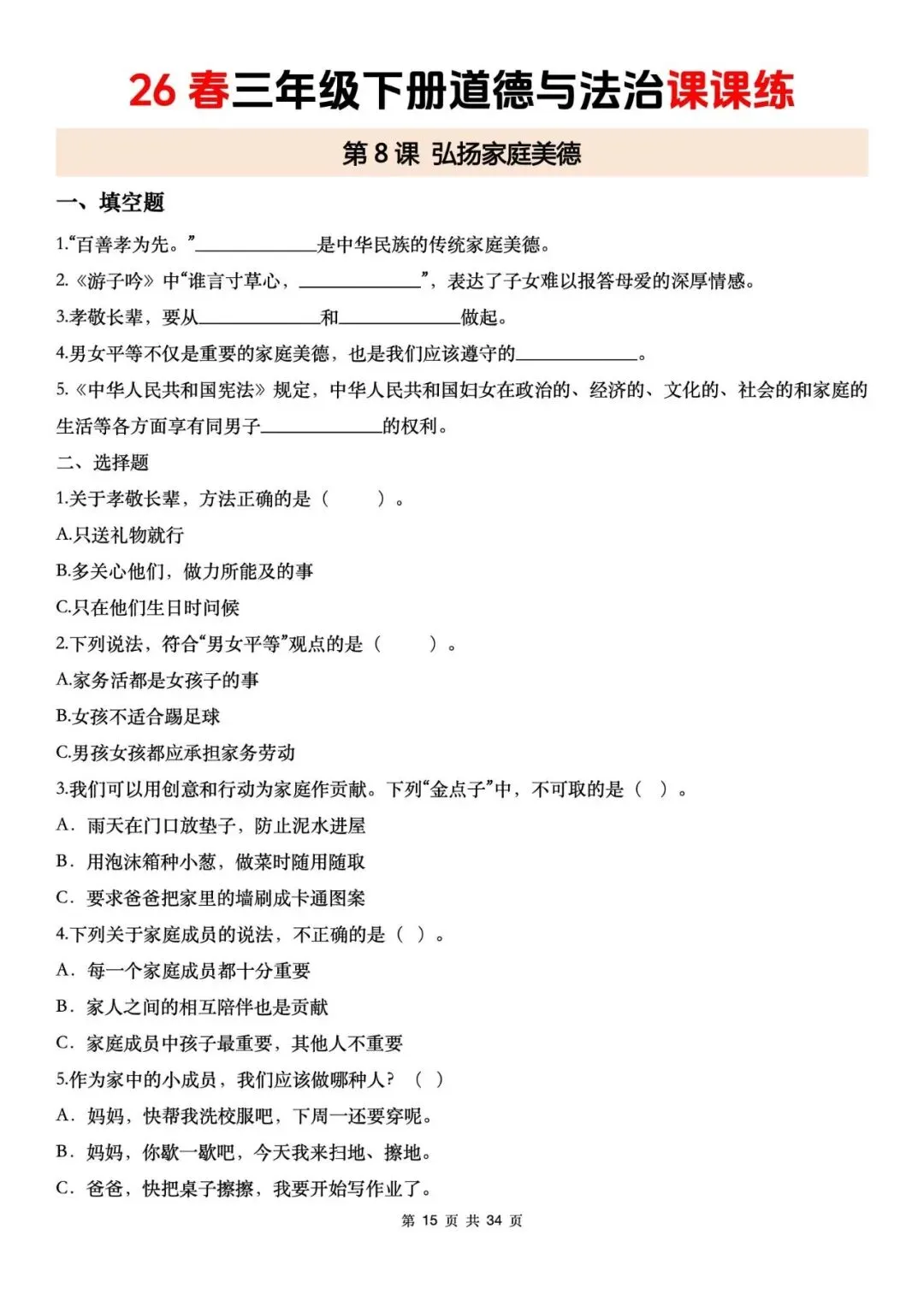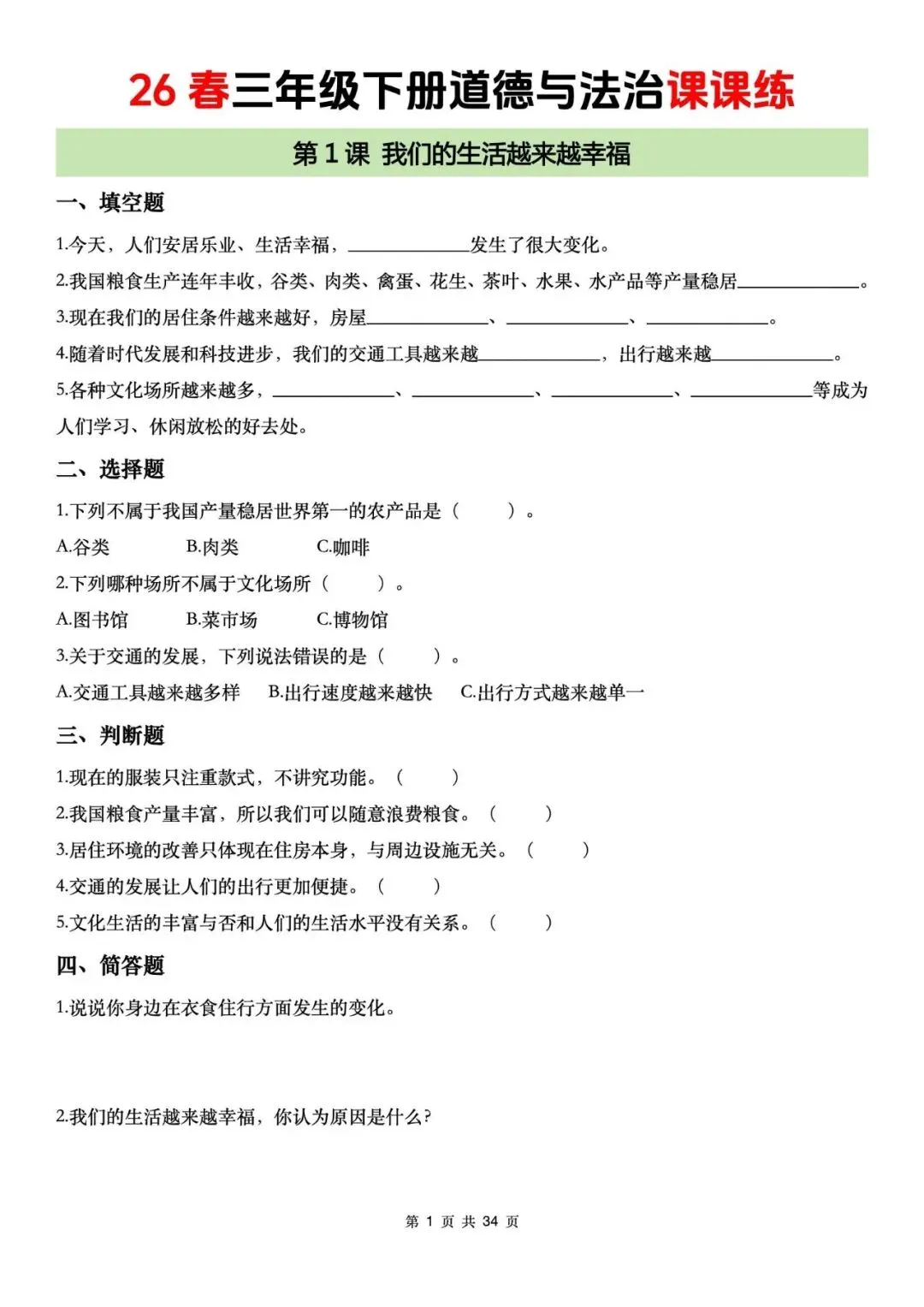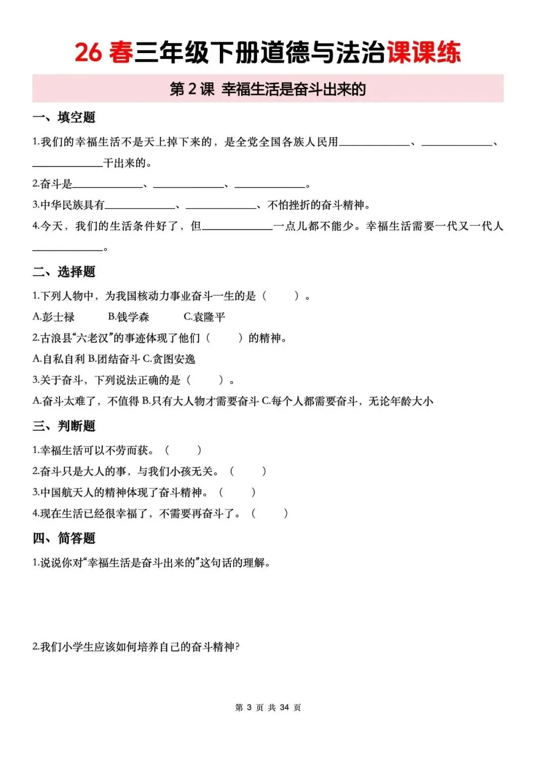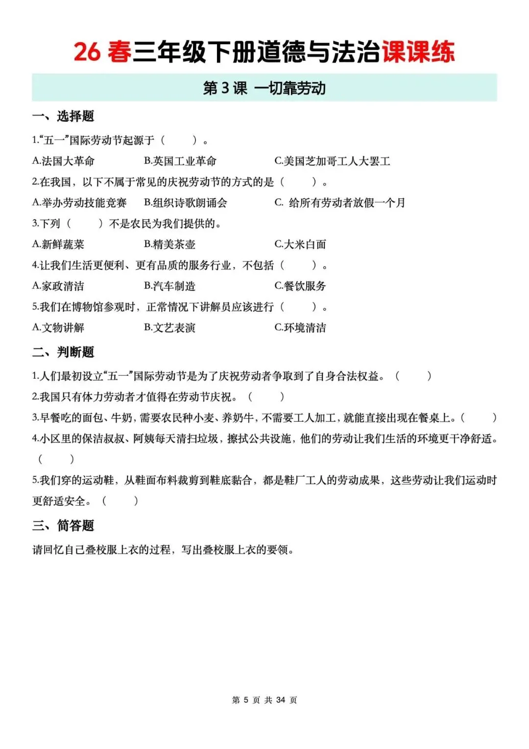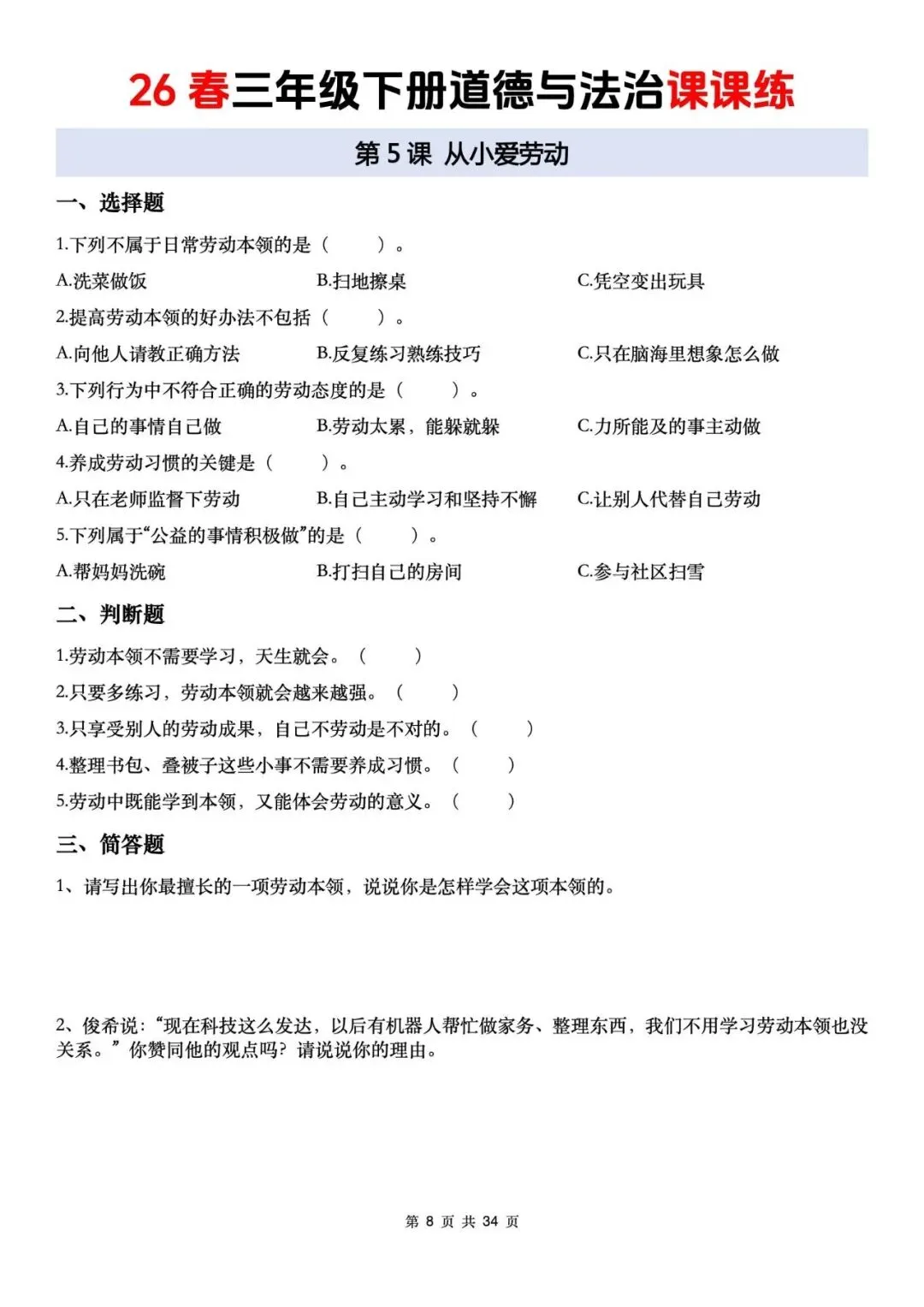 26春新部编版三年级道德与法治下册全册课课练;共34页;电子版可打印