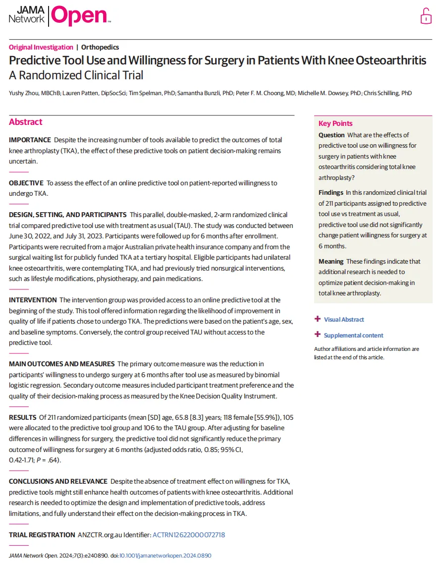 一句话总结:这篇文章最值得借鉴的,不是又做了一个膝关节置换预测工具,而是它把“工具开发”往前推了一步,真正去检验工具是否会影响患者决策。它最大的启发,不是AI工具没有用,而是预测信息如果不嵌入完整的决策支持流程,往往不足以改变真实临床选择。如果读者想从中长出自己的题,最该抓住的是把“预测”升级为“决策支持”,把结局从“愿不愿意做”升级为“是否做了更匹配的决定”。