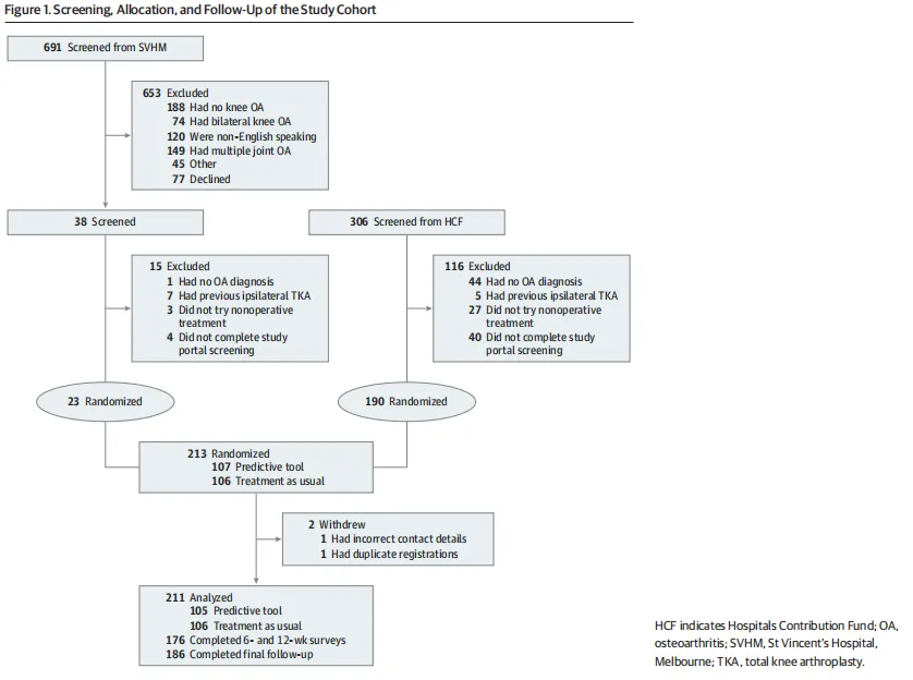从设计上看,这是典型的平行、双盲、两臂随机临床试验。严格说不是典型多中心,研究协调由一个大学研究中心完成,招募来源有两个:一家三级医院候诊名单和一个大型私保会员群体。更准确的说法是单一协调中心、双来源招募。它是前瞻性、随机、双盲的,带一点务实色彩的工具干预试验。纳入逻辑服务主问题:围绕“正在考虑TKA的单侧膝OA患者”来设,且要求既往尝试过非手术治疗。排除里真正有选择性影响的是英文理解和网络接入要求,这决定了样本天然更偏数字健康可及人群。