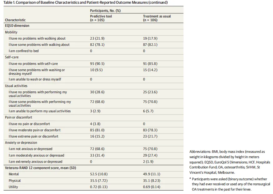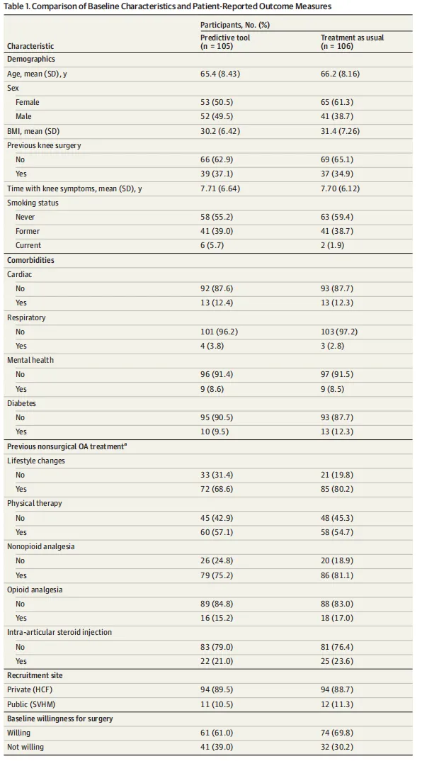 它能发出来,我觉得主要靠三点。一是研究问题确实切中临床痛点:不是传统“某药有效吗”,而是“一个预测工具进入诊疗路径后,患者会不会因此改主意”。这类问题兼具临床价值、卫生政策价值和数字医疗热度,JAMA Network Open很吃这一套。二是设计总体匹配问题。要回答“工具会不会改变决策”,最合理的就是随机分配工具使用与否,而不是前后对照或满意度调查。作者用了parallel、double-masked、2-arm RCT,在工具评估研究里已经算认真了。三是人群界定清晰,虽然带着明显的招募结构偏倚。纳入条件相对干净:45岁以上、单侧膝OA、考虑TKA、尝试过非手术治疗、会英文、能上网。但样本主要来自私保人群HCF,真正来自公立医院候诊名单的比例很小,Table 1里两组约89%都来自HCF,SVHM仅约10%到11%。这意味着它研究的更像“正在考虑手术的、数字可及的、偏早期或资源更充足的人群”,而不是全部TKA候选者。