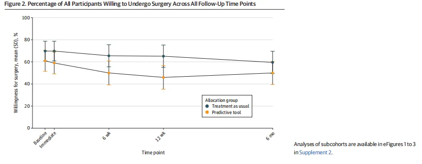 终点设置是这篇文章最值得讨论的地方。主要终点是6个月时“是否愿意做手术”的二分类问题。这个终点的好处是直观、低成本、能快速做RCT;坏处也非常明显:它只是一个替代性行为意向指标,而不是实际手术、决策一致性、决策冲突、长期结局,甚至不是一个标准化程度很高的shared decision-making终点。换句话说,它好测,但不够硬。对照框架基本成立,工具组和TAU组都在网站输入相同变量,只有工具组会看到预测结果,这一点其实做得不错,至少把“填写数据本身”的影响尽量平衡了。双盲也用了limited disclosure,研究团队分析时也保持盲态。只是这仍然是个相对“弱干预”:一次性线上反馈,没有和门诊沟通、教育模块、医生会谈整合在一起。