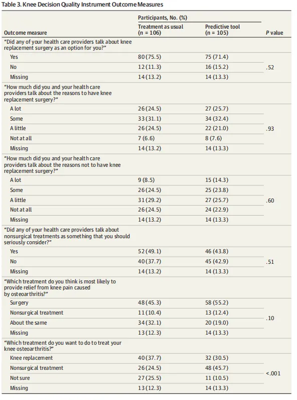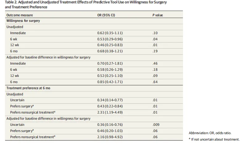 核心干预不是药,也不是手术,而是一次性的在线预测反馈。工具根据年龄、性别和基线症状生成术后健康相关生活质量改善概率,并以1到10的decile呈现。这个设定很重要,因为它决定了工具本质上只提供“术后获益概率”,并不包含完整决策教育。主要终点是6个月时willingness for surgery,次要终点包括treatment preference、treatment uncertainty和Knee Decision Quality Instrument的各项反应。作者把“愿不愿意做手术”放在比“决策质量”更核心的位置,这本身就决定了整篇论文的逻辑方向。最关键的协变量其实就是基线手术意愿,因为随机后两组在这点上不平衡,后续几乎所有关键分析都得为它做调整。作者自己也承认这一点。