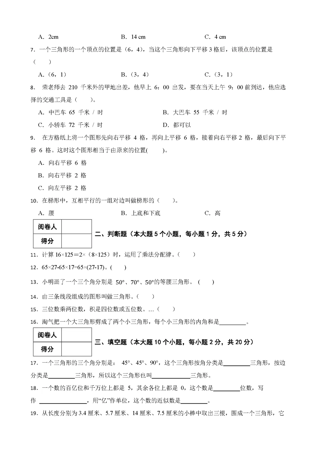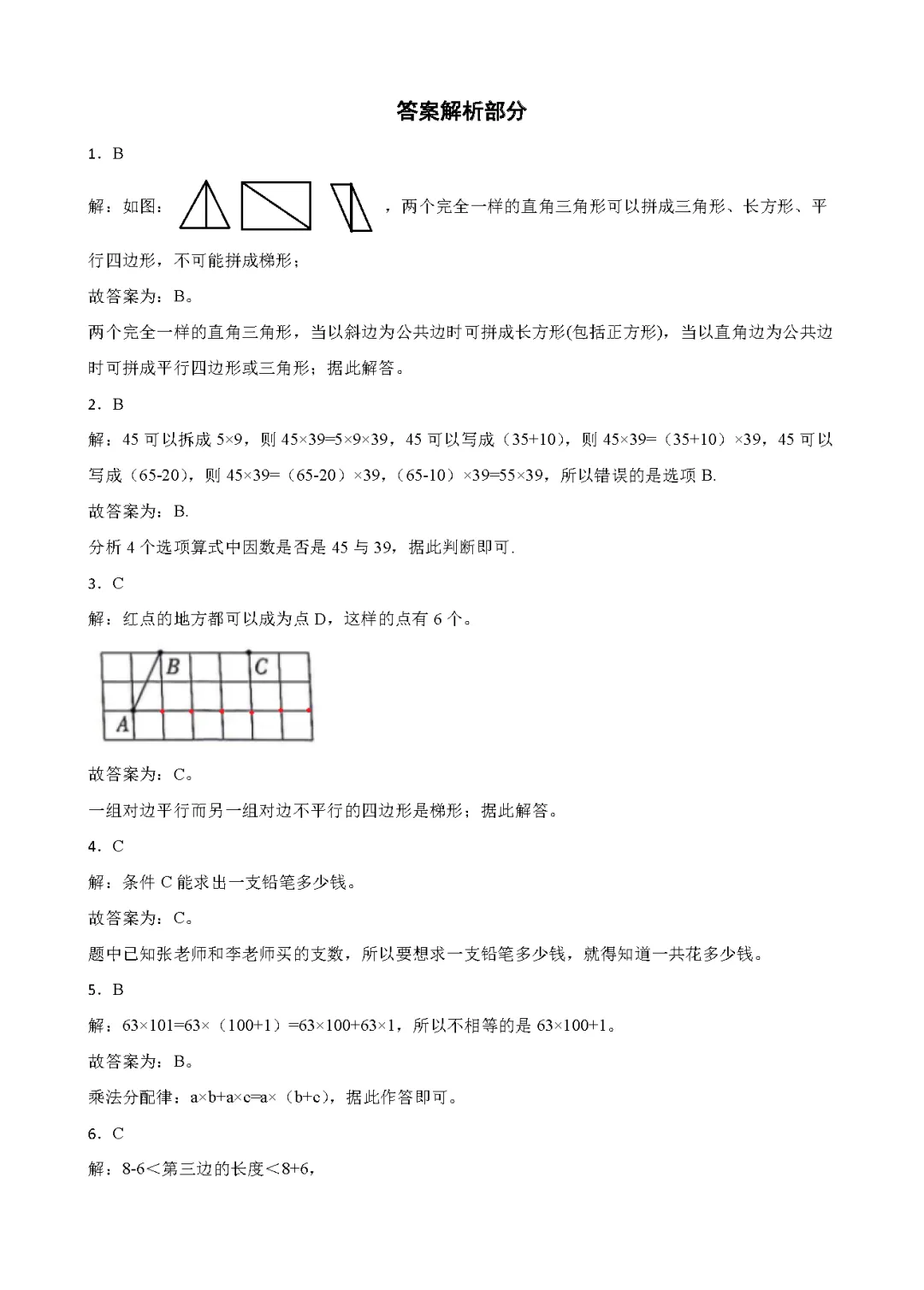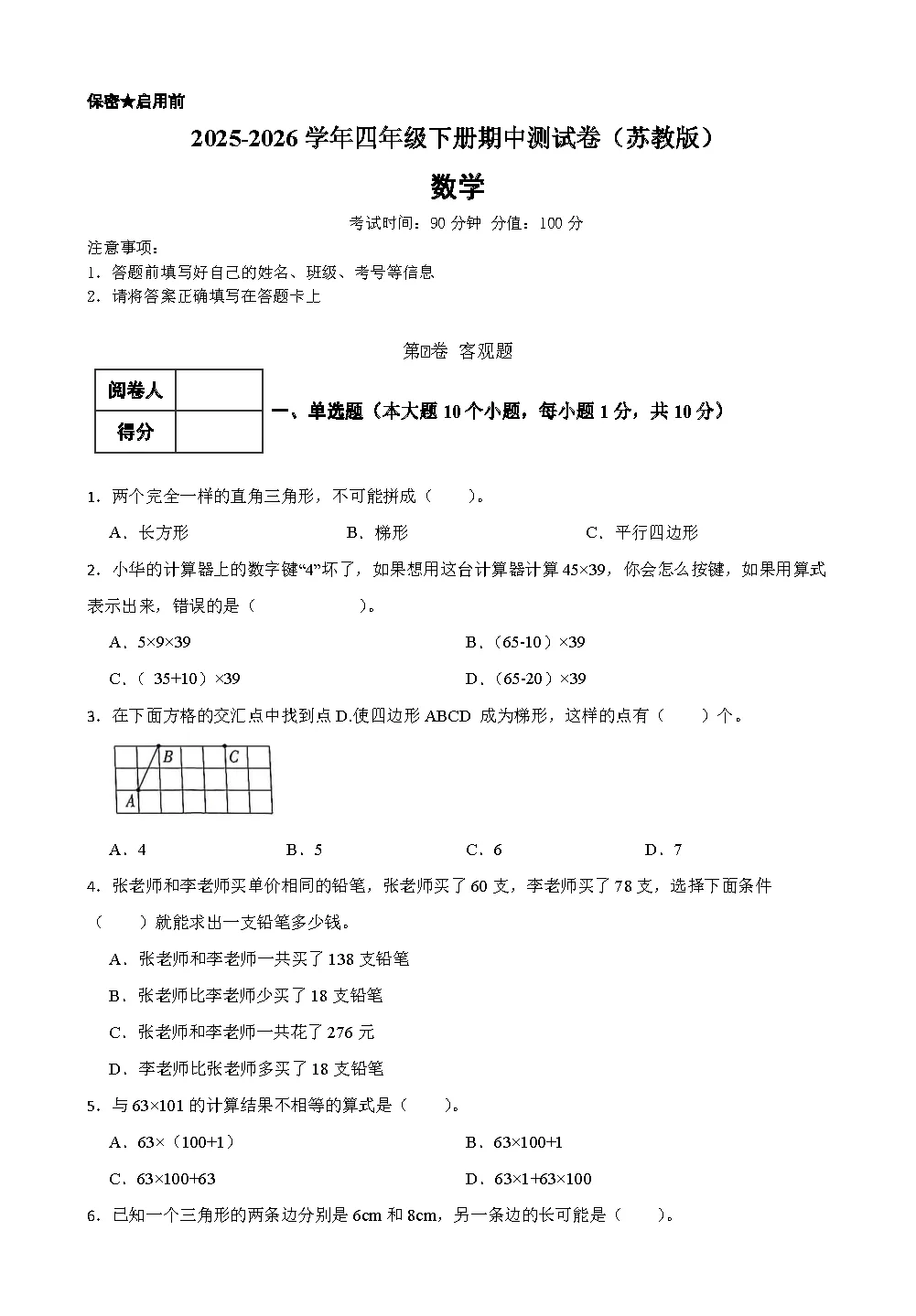 26春苏教版数学4年级下册《期中测试卷》有答案,建议各位家长领取打印给孩子测试!