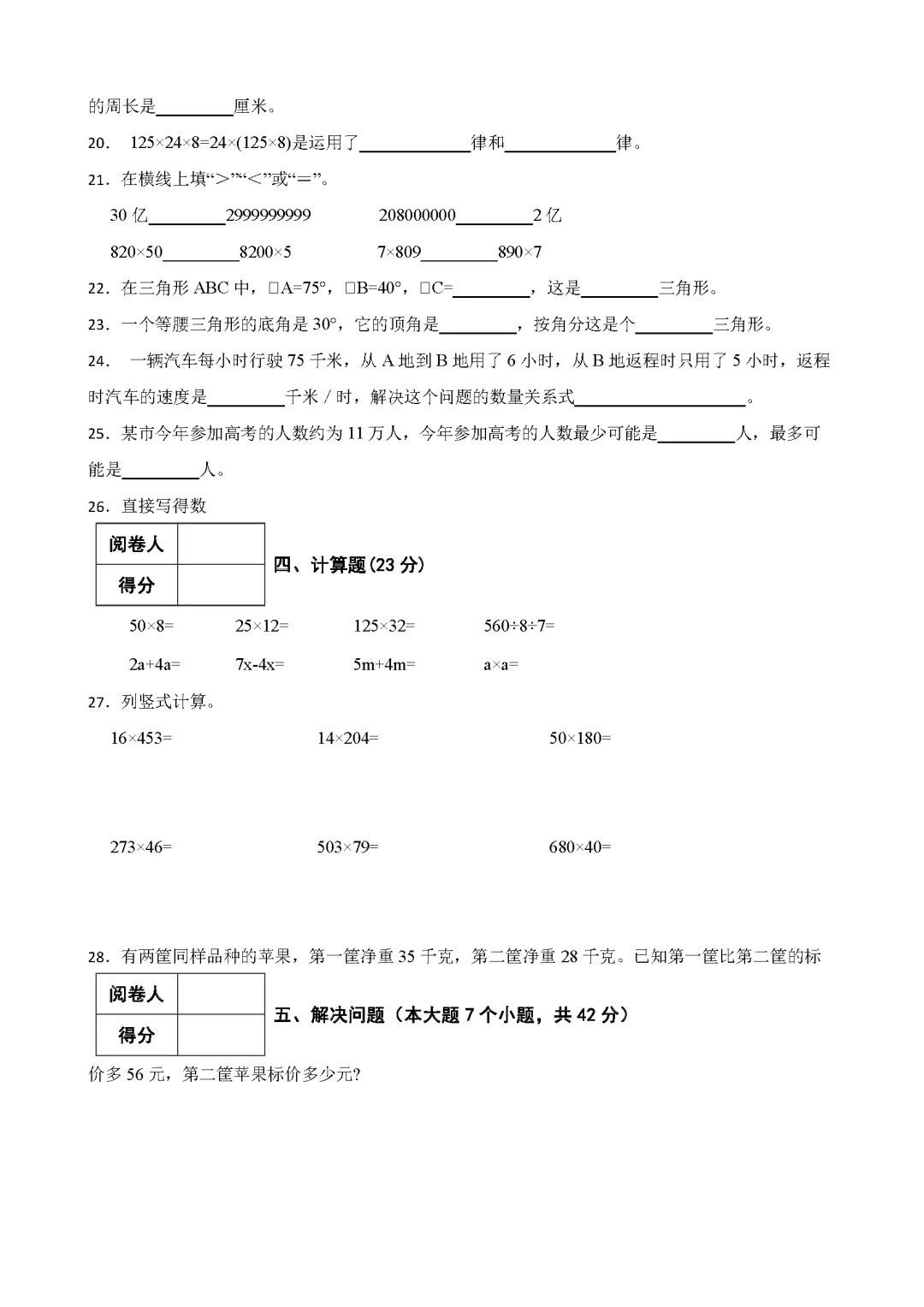 26春苏教版数学四年级下册《期中试卷》丨可下载打印