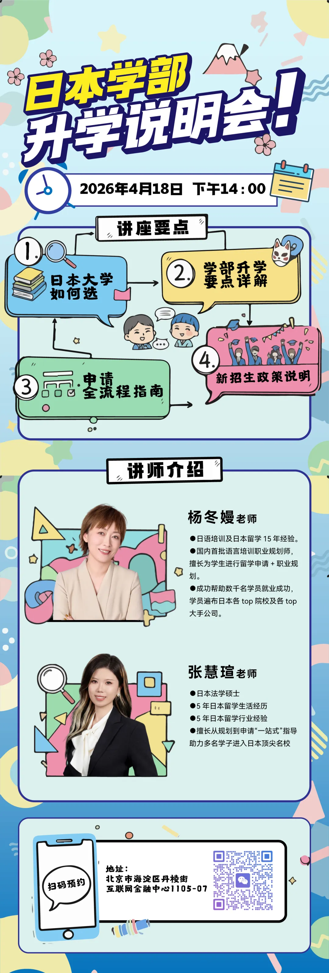 不管是择校规划、申请流程,还是应对新政策,现场都能一次性答疑解惑,帮你避开申请雷区,少走弯路! 名额有限,立即滴滴我锁定席位,离日本名校更近一步!