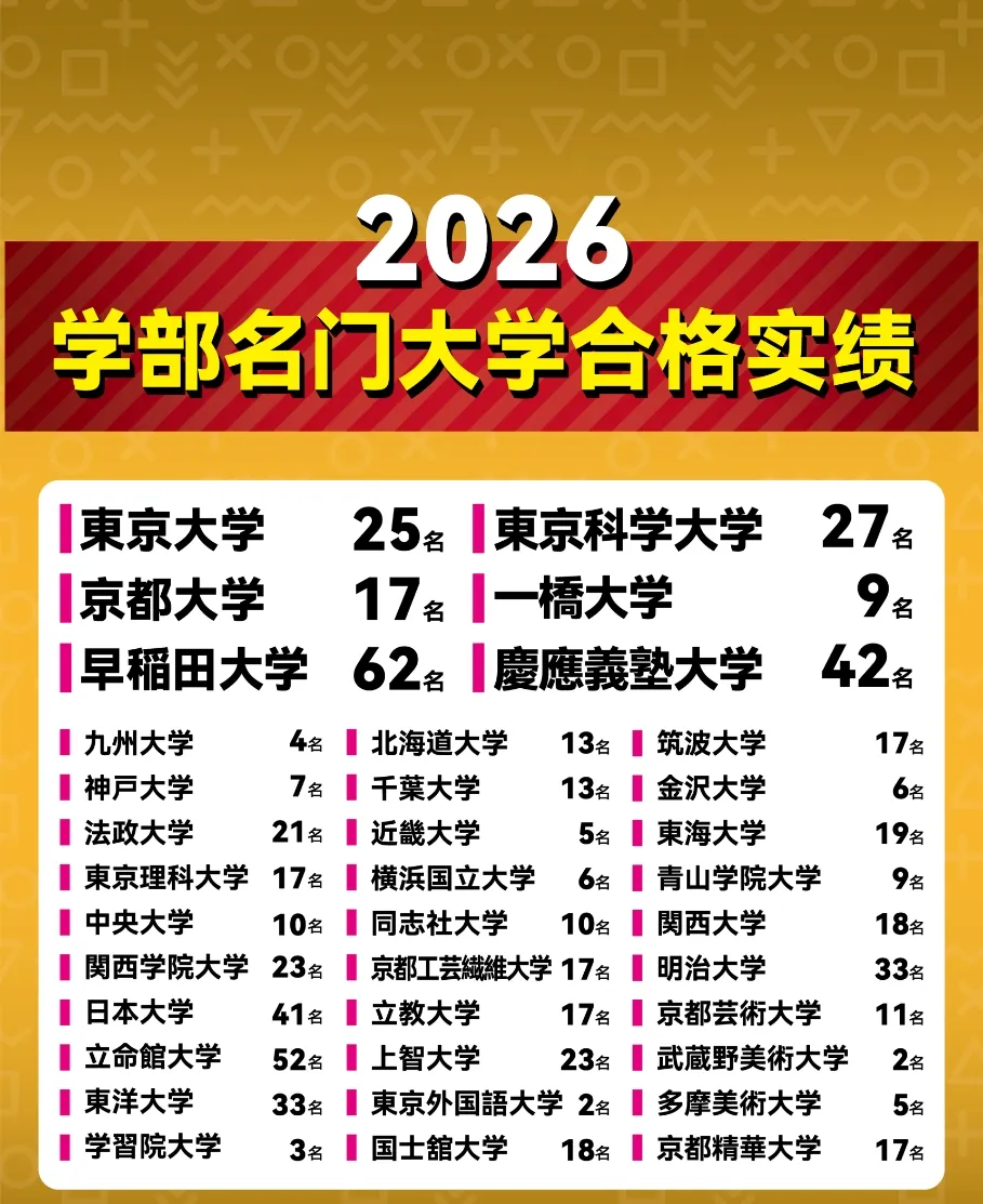 过去一年,我们拿下东大 25 名、京大 17 名、早稻田 62 名等海量顶尖大学合格实绩,学员遍布日本 TOP 院校和大手企业,实力看得见!