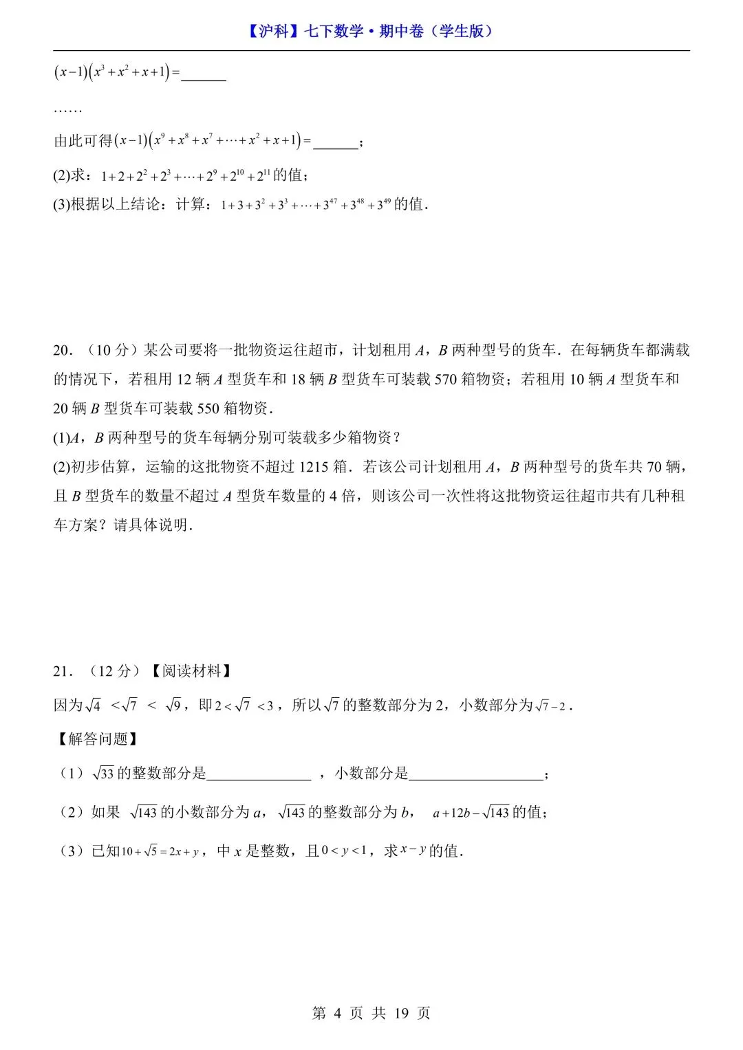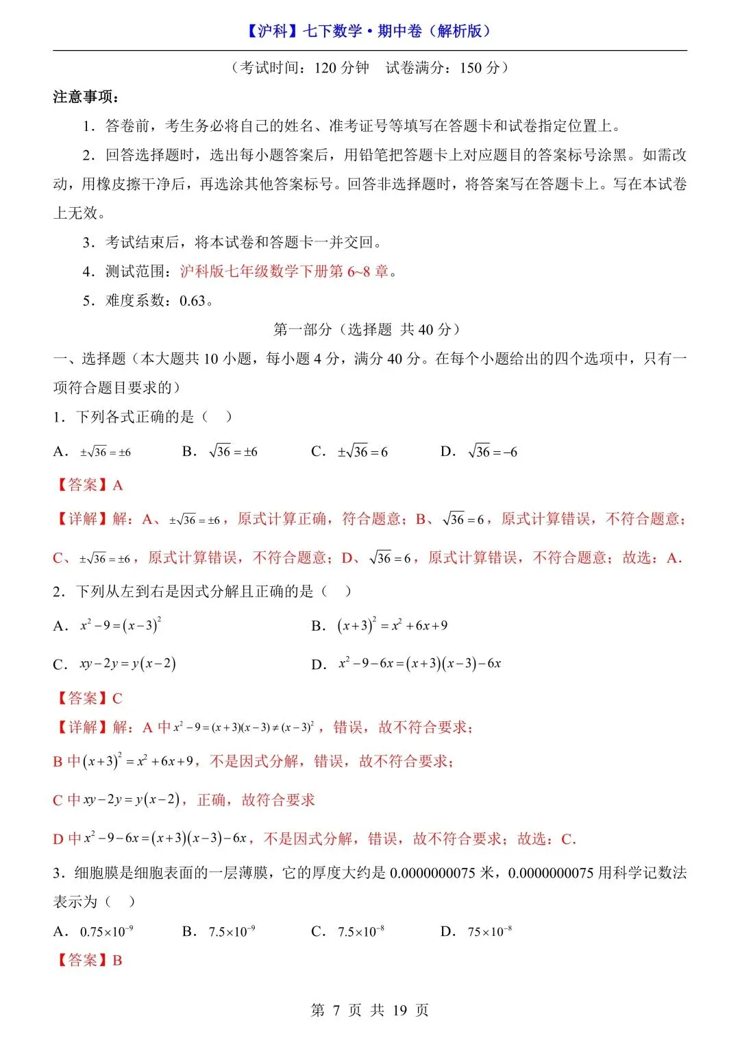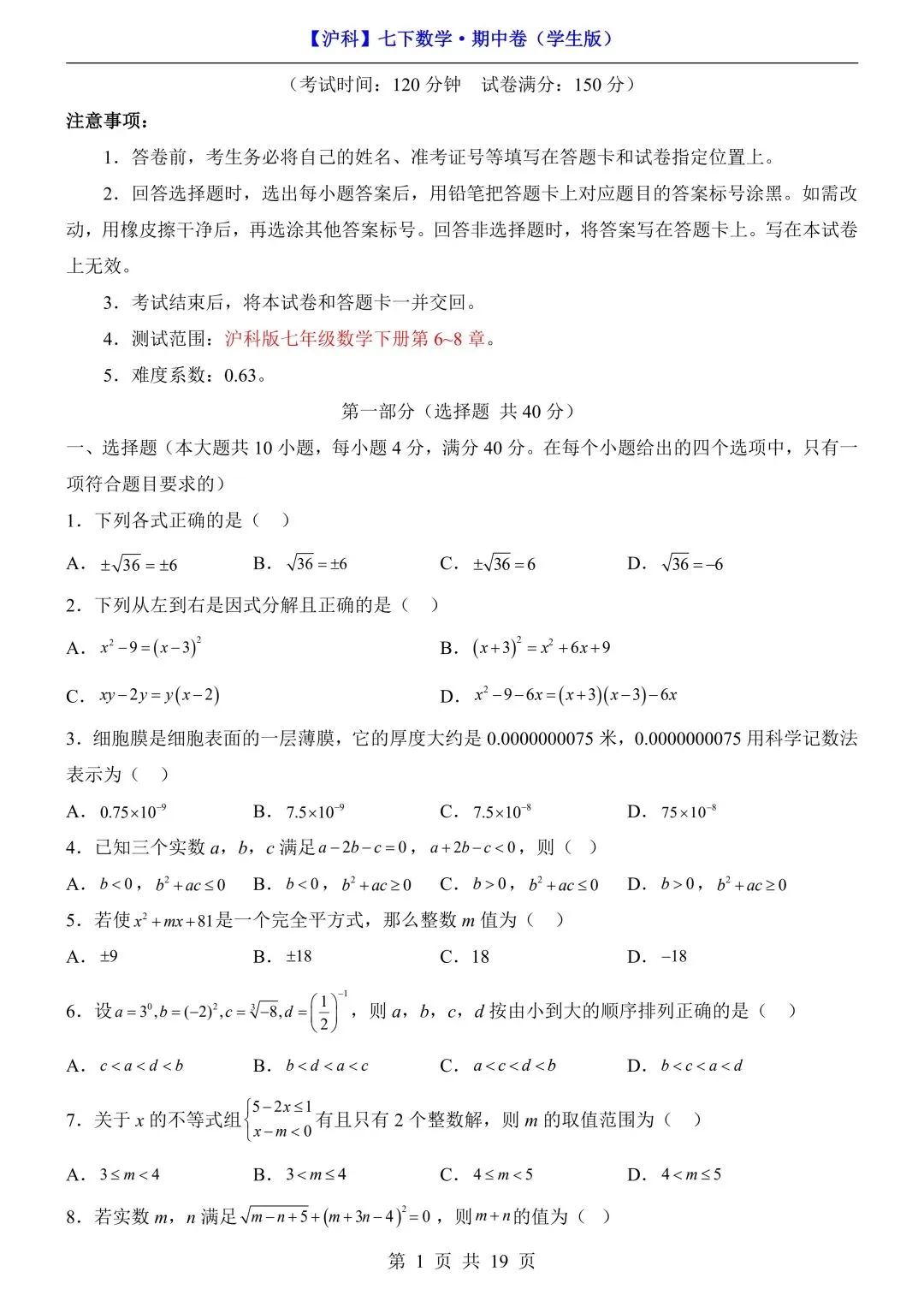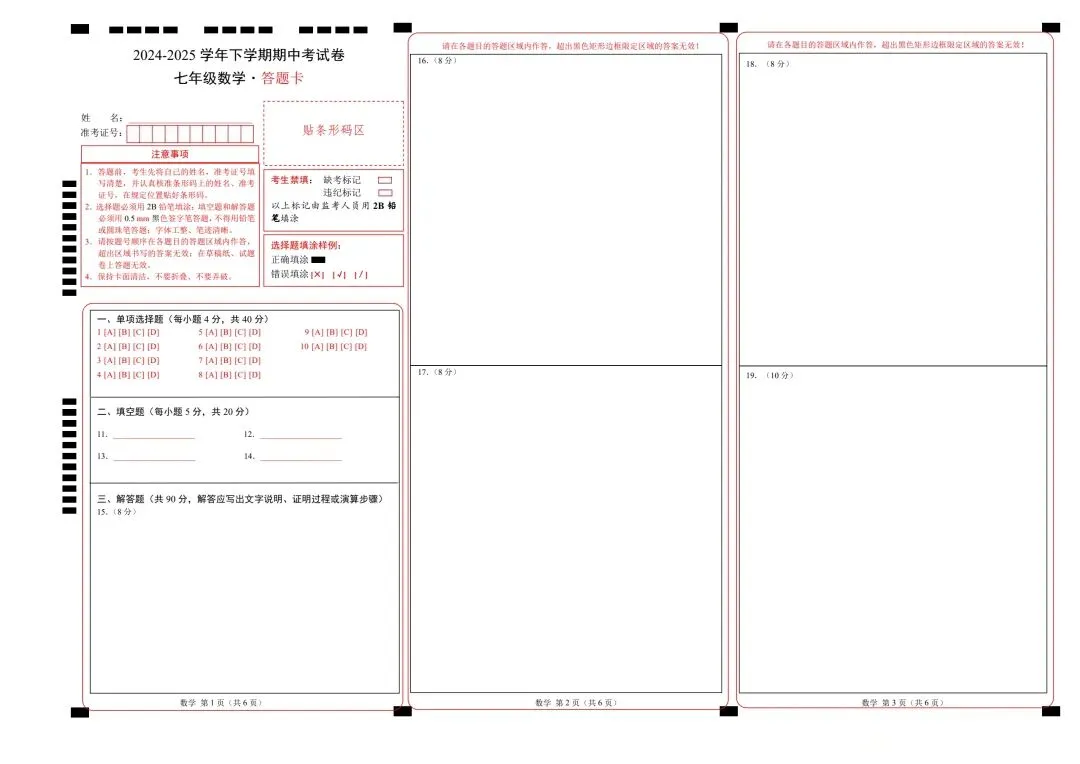 26年春七年级初一下册沪科版数学期中模拟测试卷【附答案+答题卡】丨高清电子版可打印(415)
