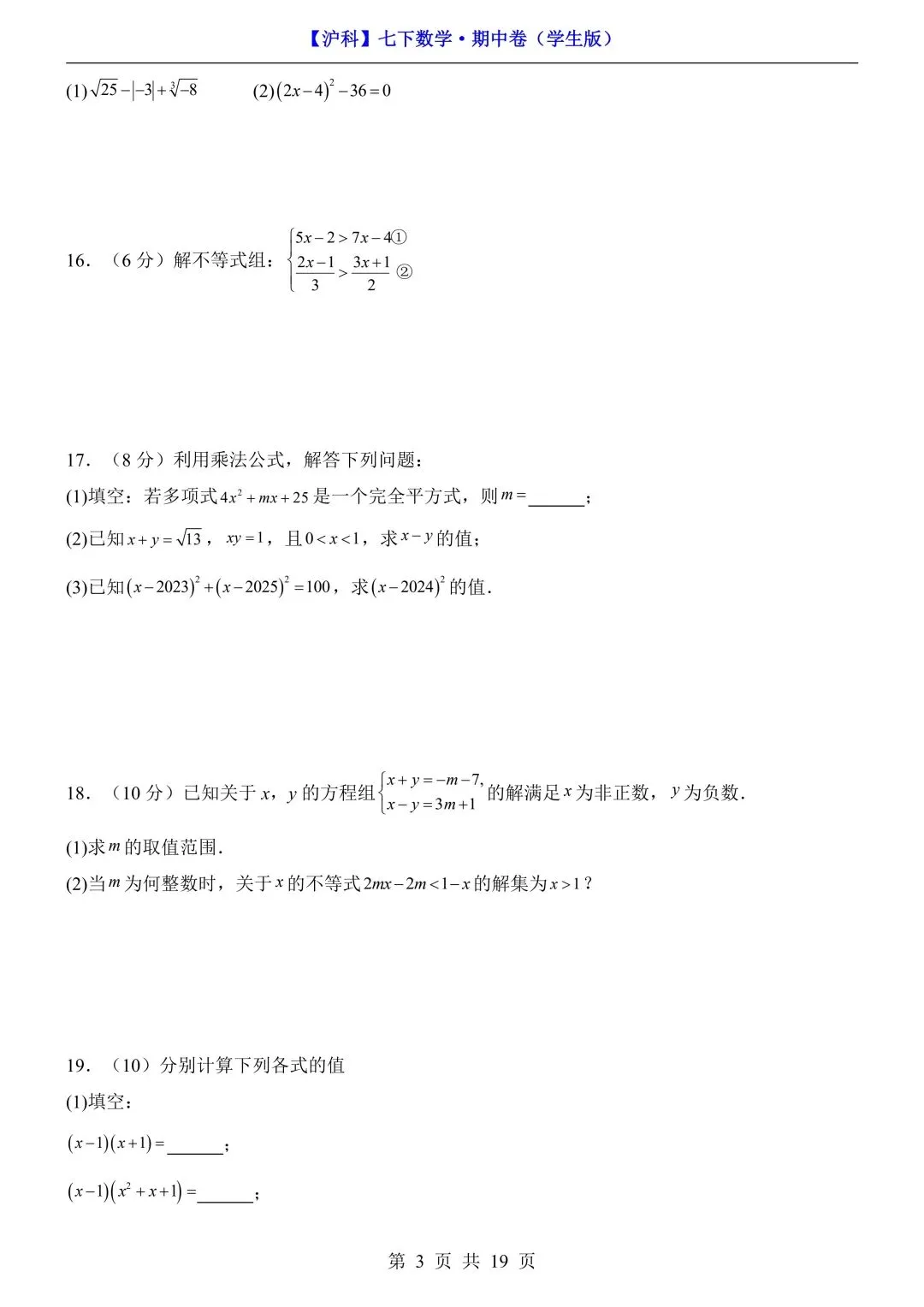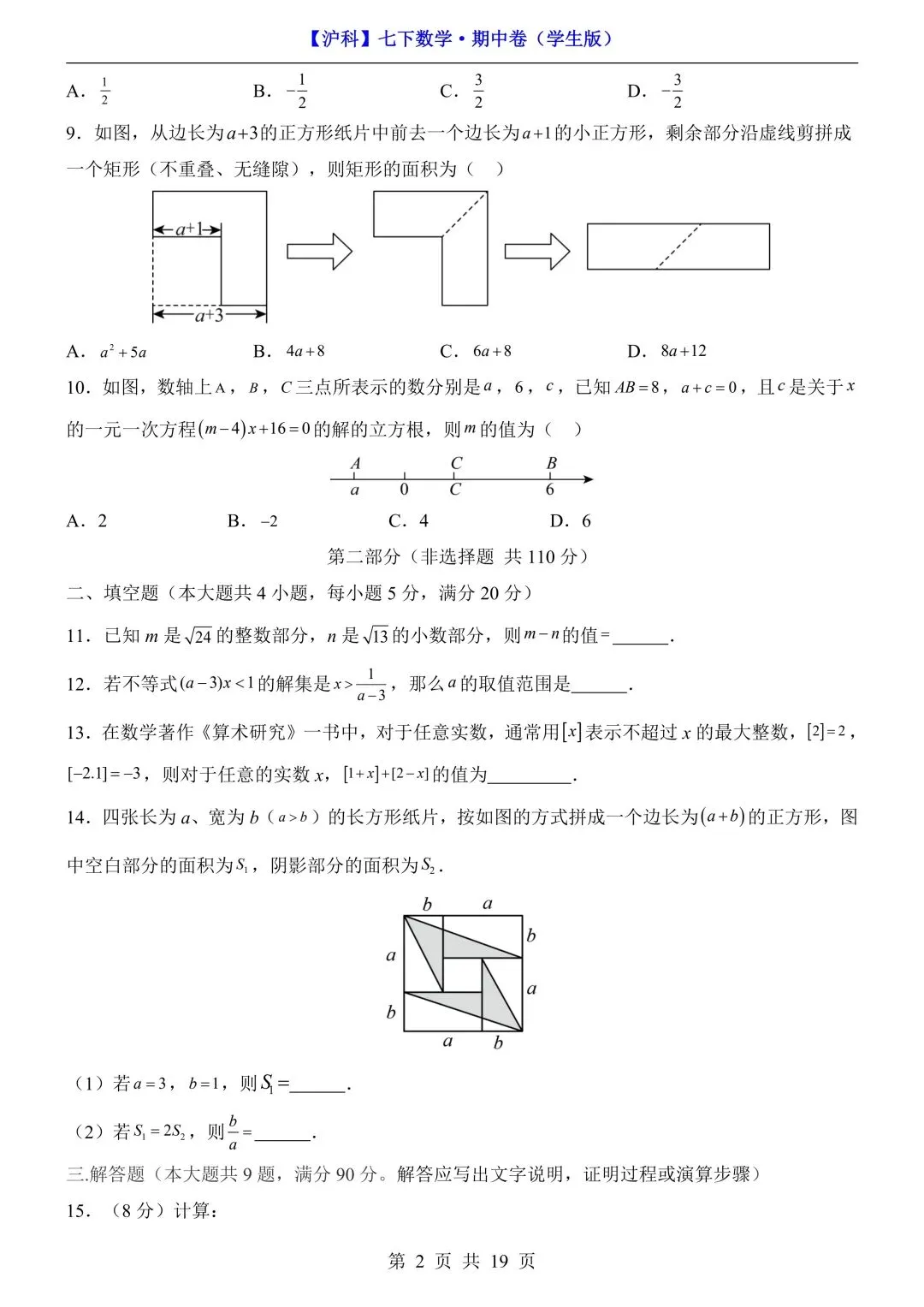 26年春七年级初一下册沪科版数学期中模拟测试卷【附答案+答题卡】丨高清可打印(415)