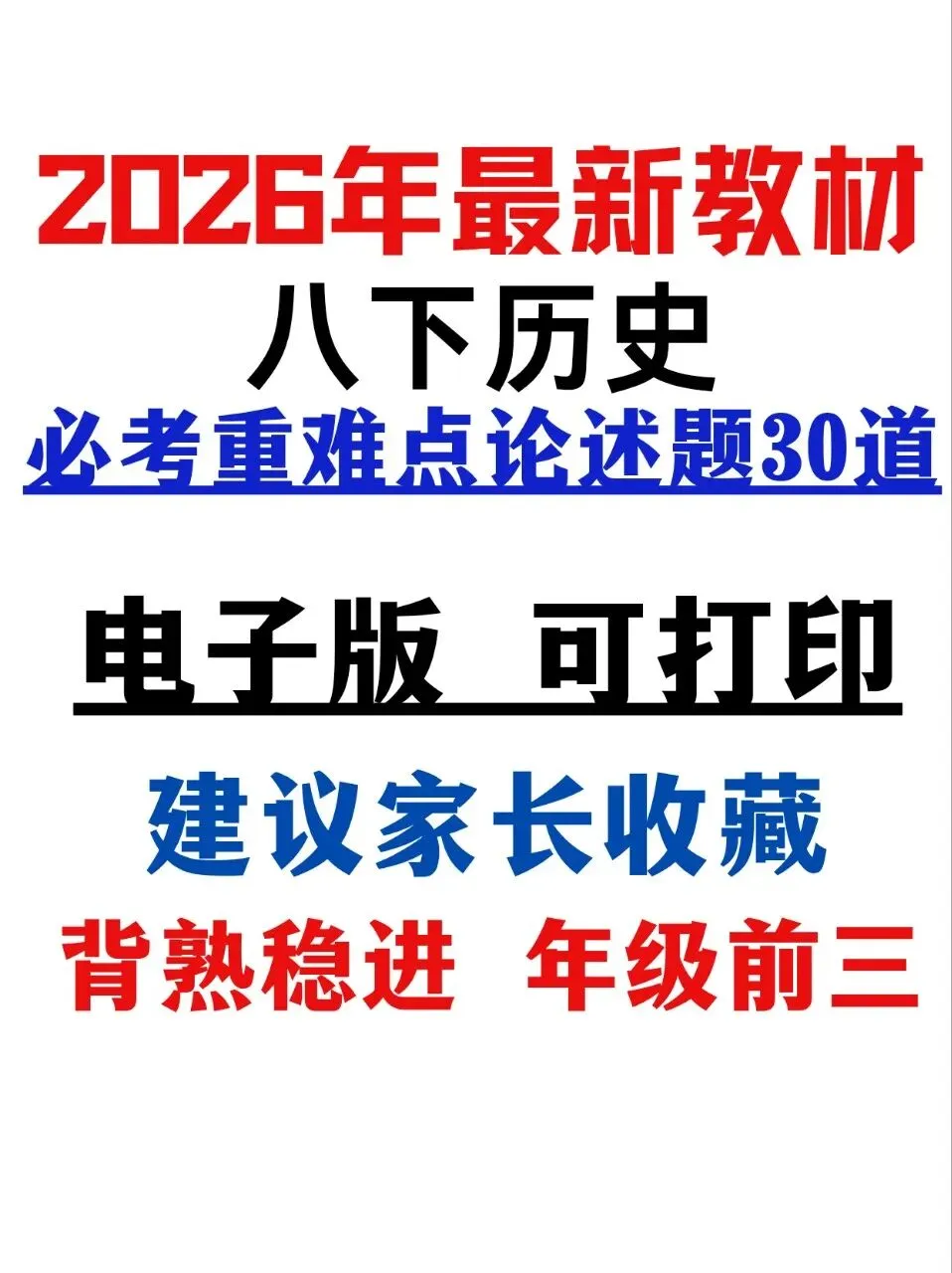这份资料是结合八下历史期中考点,专门整理的必考论述题30道,覆盖全册核心重难点,每一道都标清答题思路、关键得分点和规范话术,不用自己瞎琢磨,直接照着背、照着练就行。平时预习、考前复习都能用,基础薄弱也能快速提分。