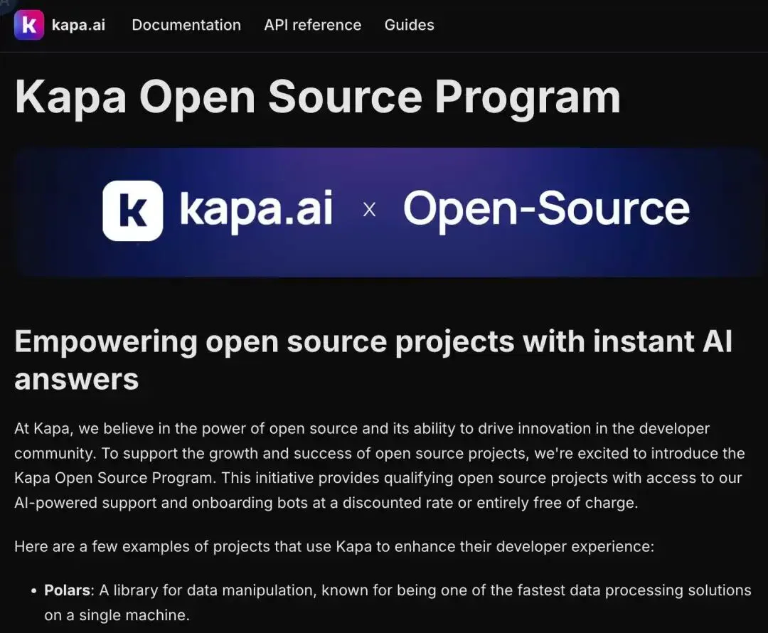 解决上述一切问题的答案便是:kapa.ai。它们发布了支持开源项目计划(https://docs.kapa.ai/kapa-for-open-source)。