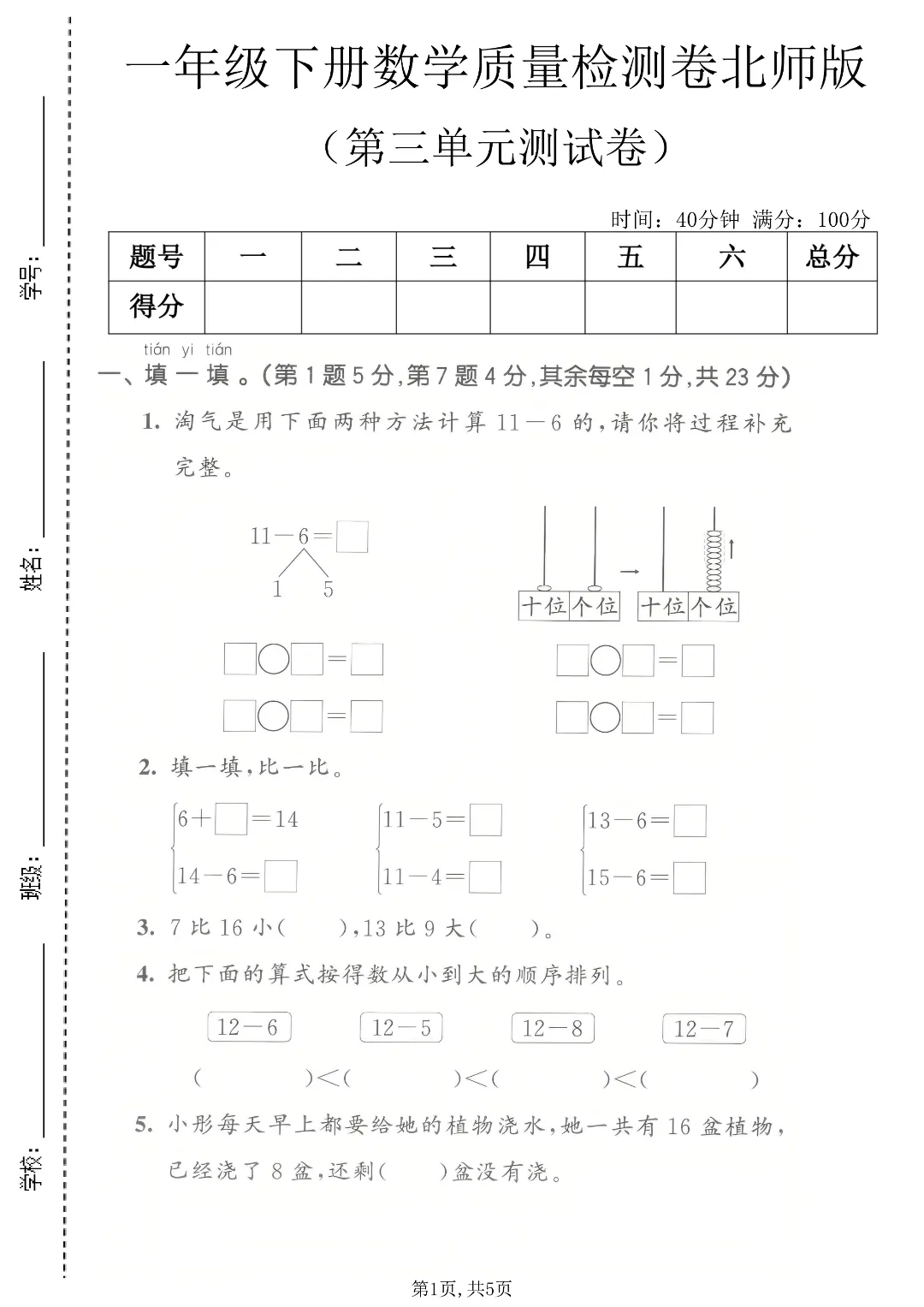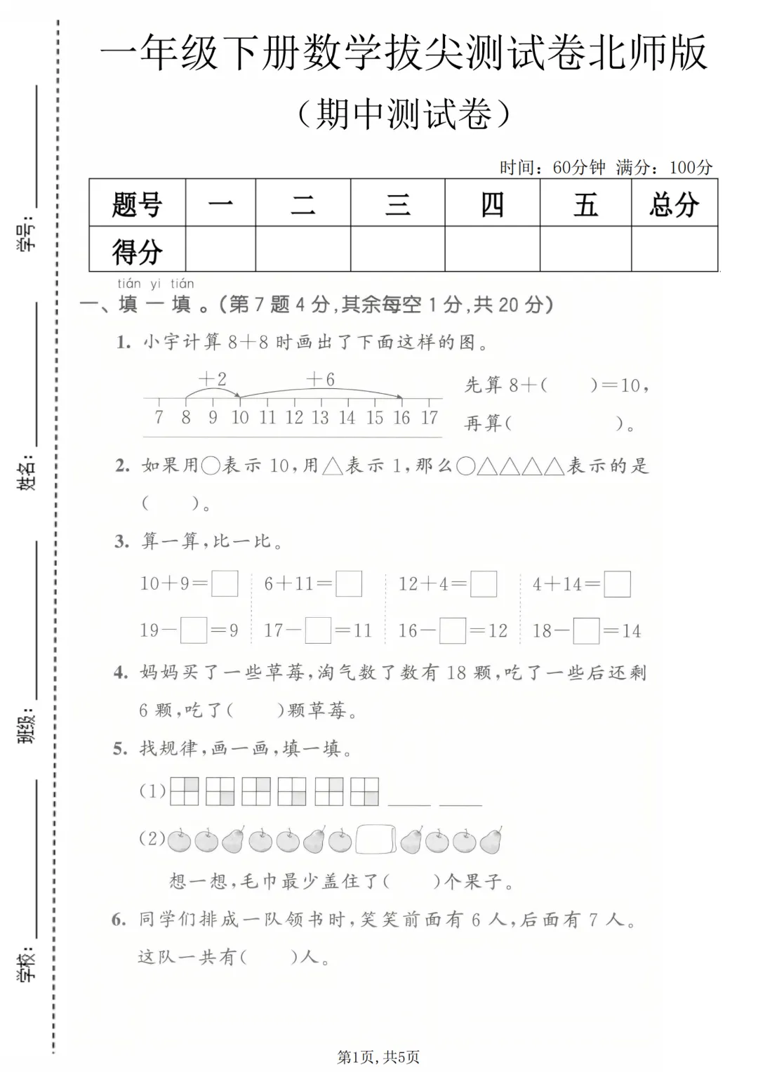 26年春新一年级下册北师大版数学《期中考试测试卷+1-4单元检测卷》6套附答案解析‖高清可打印