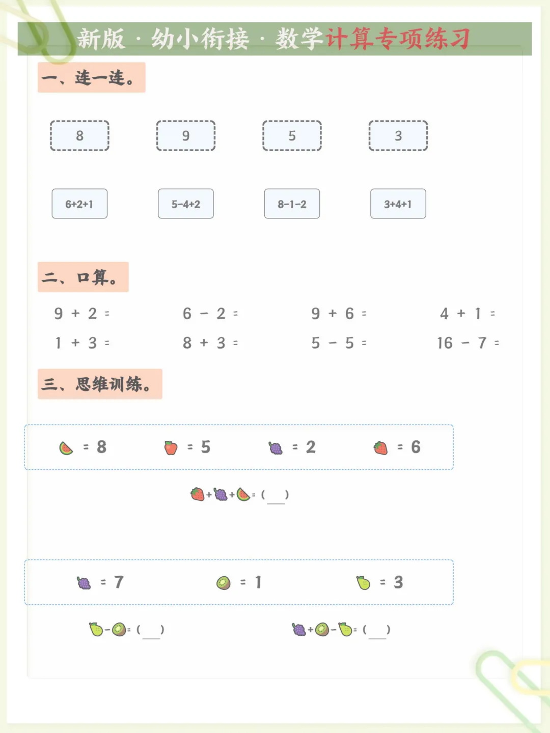 新版·幼小衔接·数学计算专项练习,共5页,电子版可下载可打印,这份资料围绕幼小衔接阶段的数学计算训练设计,涵盖多个核心知识点与专项训练内容,适合家长在入学前帮助孩子进行针对性练习,逐步提升计算能力与做题熟练度,也能让孩子提前适应规范的练习节奏。需要的家长可以及时下载打印出来,让孩子练一练。