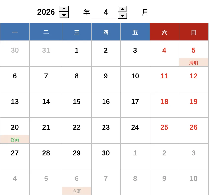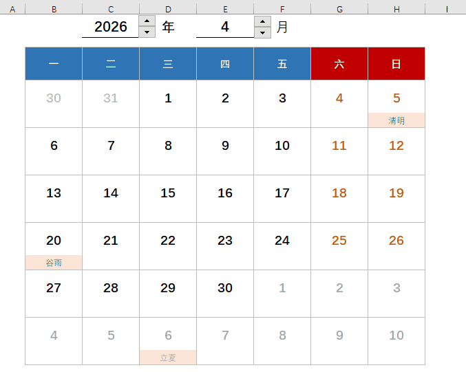 假设现在是2026年4月份,月初 = 2026-4-1 ,星期=3,即月初这一天是周三,那么B5的日期即为 月初-2,用公式写出来即为:
