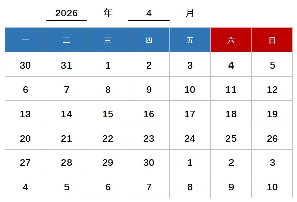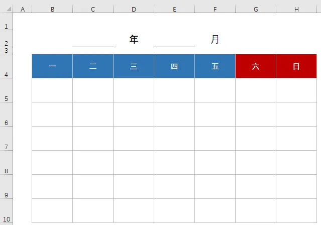 OK,再把周六周日这两列的字体设置为红色,日期就完成了。