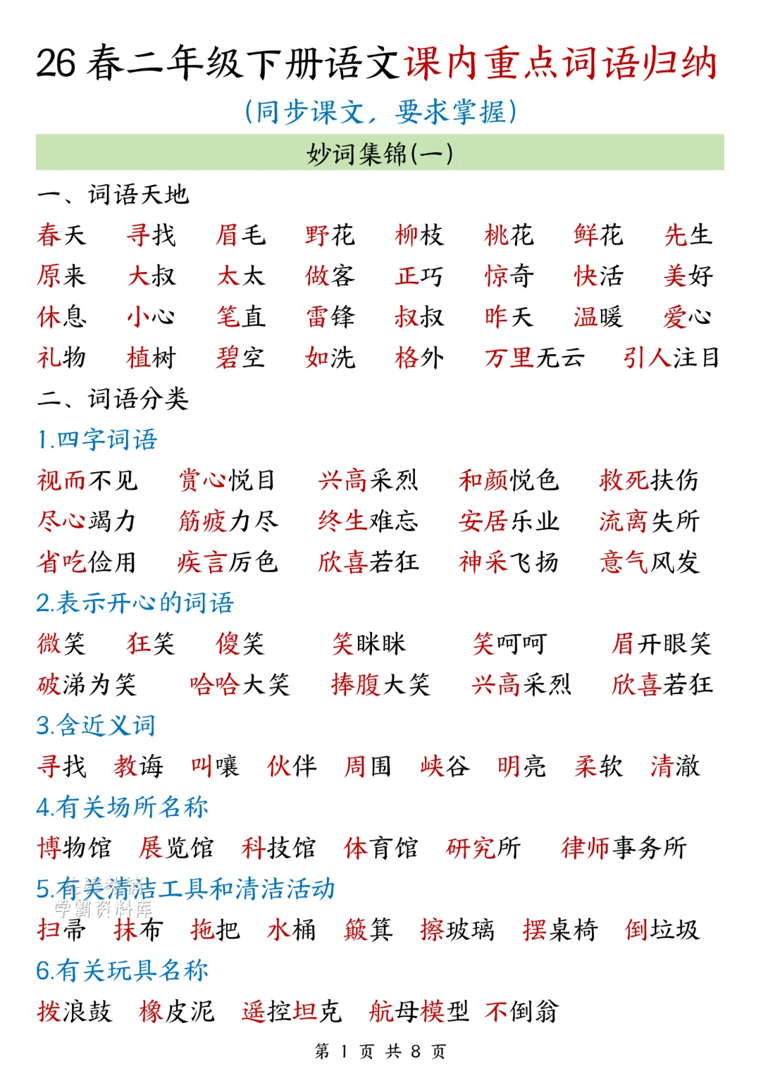 26新《二年级下册语文课内重点词语归纳》电子版可打印