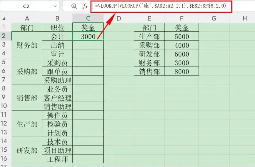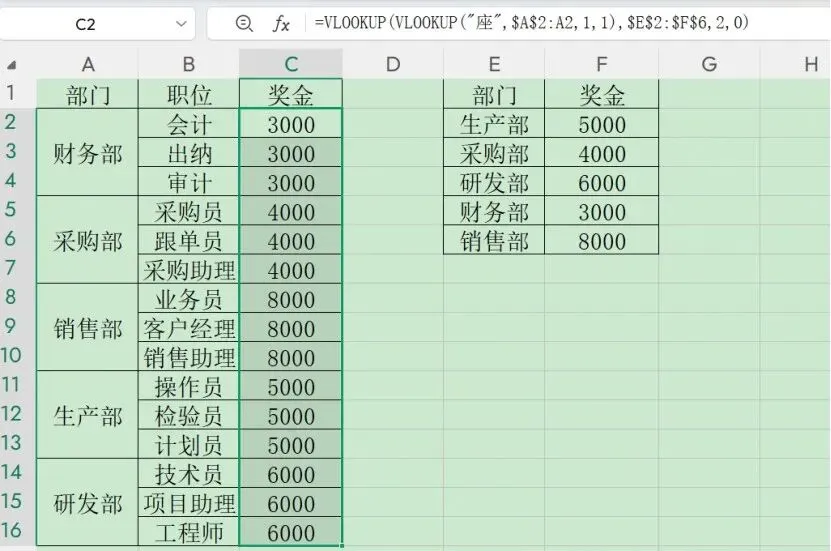 例如下图所示,当公式从C2拖到C6时,若做绝对引用和相对引用,那么”座”找到的就是C2到C6的最后有值的单元格,即“采购部”。若两个部分都做绝对引用,那么找到的依然是“财务部”。