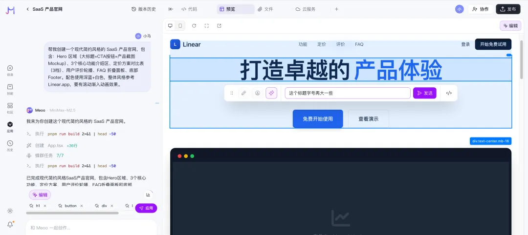 就在4月15日,阿里ATH事业群发布了一款AI开发工具“秒悟Meoo”。说它“会编程、懂设计、自部署”,最快1分钟就可以生成一个完整网站!