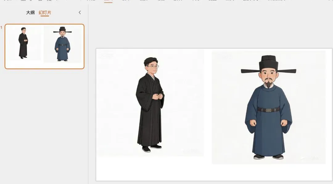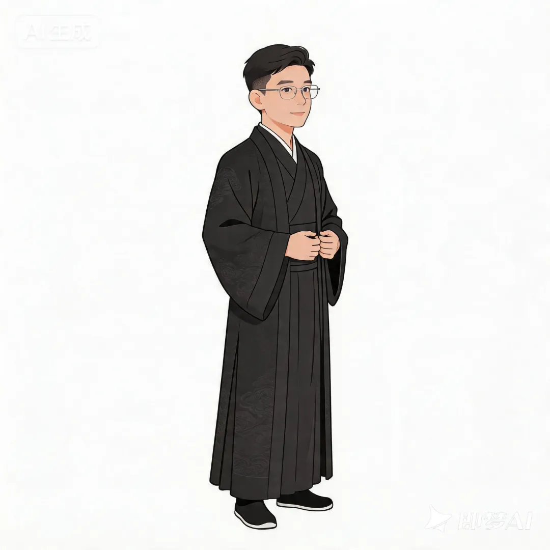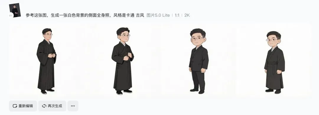 第二步:上传一张自己的照片作为参考图,提示词:参考这张图,生成一张白色背景的侧面全身照,风格是卡通 古风