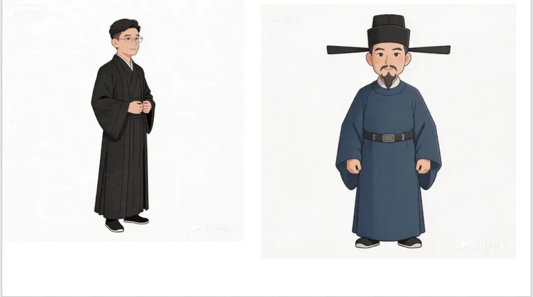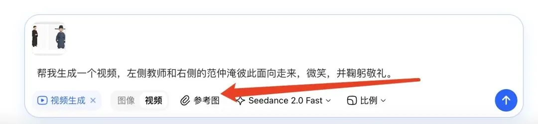 第五步:添加参考图,提示词:帮我生成视频:帮我生成一个视频,左侧教师和右侧的范仲淹彼此面向走来,微笑,并鞠躬敬礼。