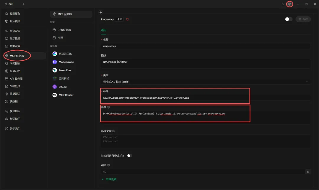 (***这个步骤连接了 cherry stdio 与 IDA的 MCP插件,以 IDA 路径下的 python 加载 MCP ,使得 cherry stdio 能够接受 MCP 传输给 cherry stdio 的 IDA上下文信息***)