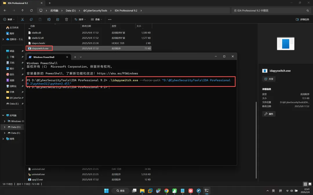 我下载的版本的 IDA 9.2 在默认运行python时不会使用311版本的,但我们是通过311版本python的pip安装MCP插件的,所以新手必须要使用 IDA 软件目录下的命令行工具,在终端运行 –force-path 参数指定 python3.dll