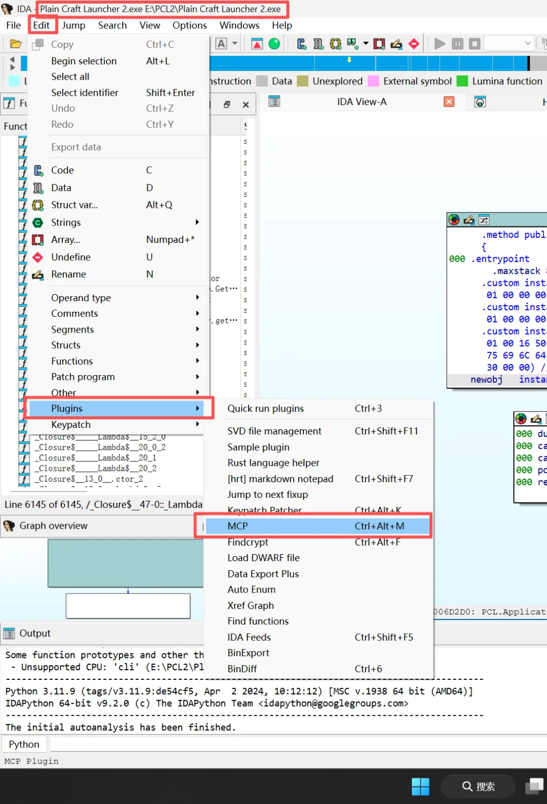 如果不这么做,你用 IDA 打开一个可执行文件开始分析的时候你在 plugins 找不到 MCP