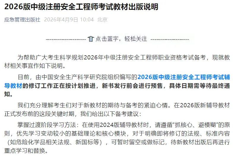 官方发布:关于26年中级注安教材出版说明!
