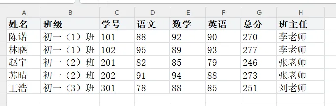 Excel数据源:新建表格,第一行填「表头」(姓名、班级、学号、语文、数学、英语、总分、班主任),表头无空格、无特殊符号;第二行开始填学生真实数据,每一行对应一个学生,不合并单元格、不留空行,保存后务必关闭Excel(否则Word读不到数据)。