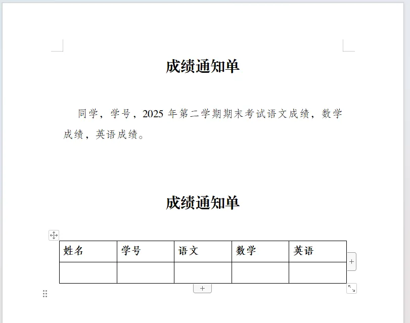 Word模板:新建Word,录入成绩单固定内容(如“成绩通知单”“XXX同学”“学号XXX”),在需要填可变数据的位置(如XXX)留空,简单排版后保存,和Excel放同一文件夹更方便。