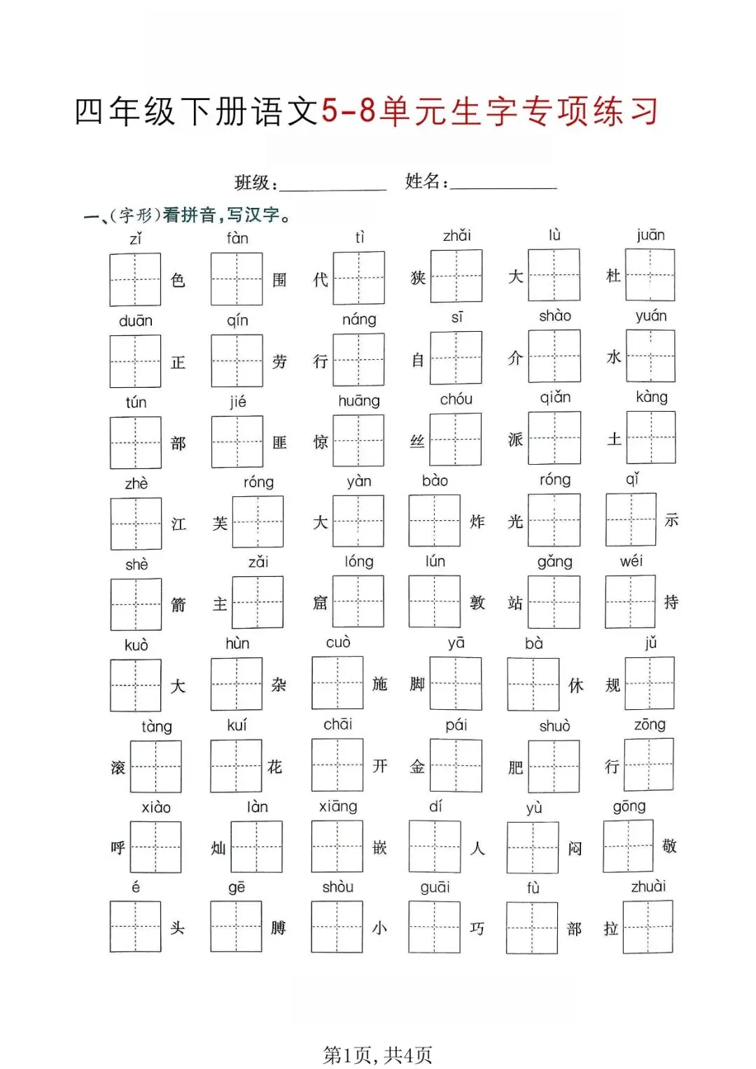 可下载丨2026 春新版四年级下册语文 5—8 单元生字专项练习,电子版