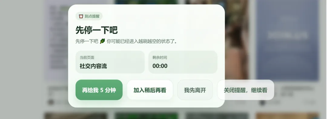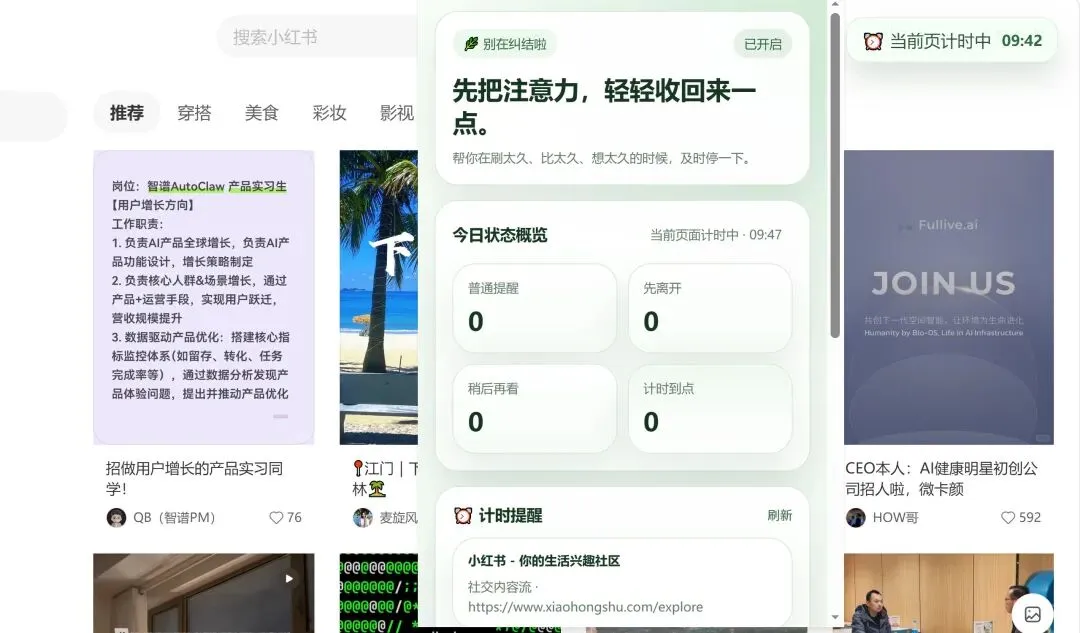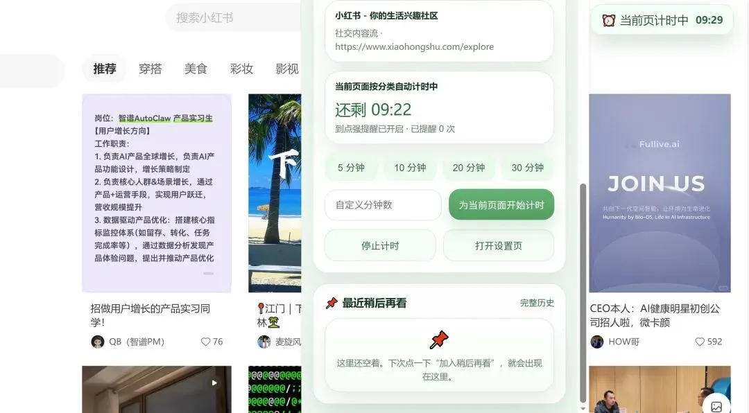 第三张图,是我最喜欢的功能:当前页面计时。比如我在小红书、购物网站、视频网站里一刷就停不下来,那我就可以直接给这个页面设10分钟。时间会在右上角一直显示,到了点,它不是冷冰冰地报时,而是提醒我:你已经看了很久了,要不要先停一下?