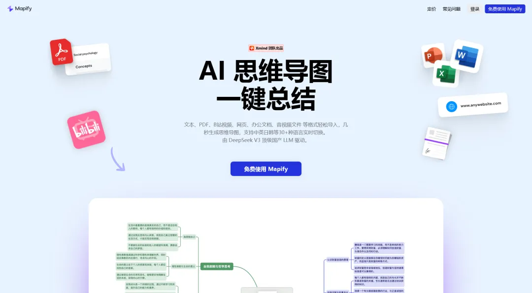 Mapify 是一款 AI 驱动的思维导图工具,能够帮助用户从多种文件格式、网页内容或视频等资料中快速提取核心观点,并整理输出为结构化的思维导图。它通过一键做图、缩放导图、内置 AI 模板等功能,极大提升了用户的生产力和创造力
