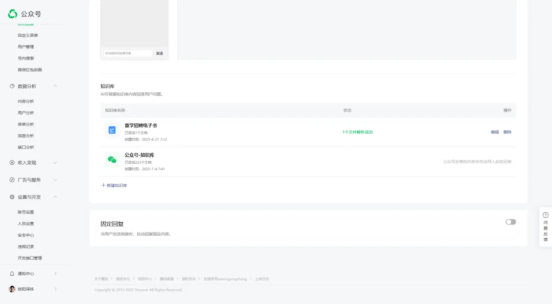公众号发表的内容会自动导入此知识库、AI可根据知识库内容回答用户问题。AI将读取30天内你手动回复的消息,学习内容和表达方式,使智能回复更贴合你的风格。通过设置提示词可以指定智能回复的效果。启用后,AI会根据你的历史发表内容和补充设定,提供智能回复。