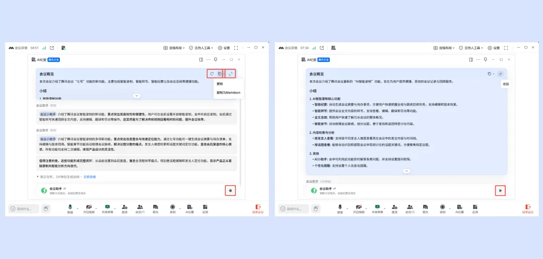“AI纪要”全新升级,自动识别关键内容与待办,实时追踪会议进展,生成结构化纪要,解放您的时间。会议概览:概述当前会议内容,总结各模块重点信息,提炼会议的结论和待办事项,并支持复制、刷新、展开。会议小结:快速总结会中各成员的观点,方便回顾刚刚会议上发生的内容。