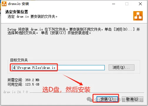 第四步:安装在D盘,然后点安装即可。